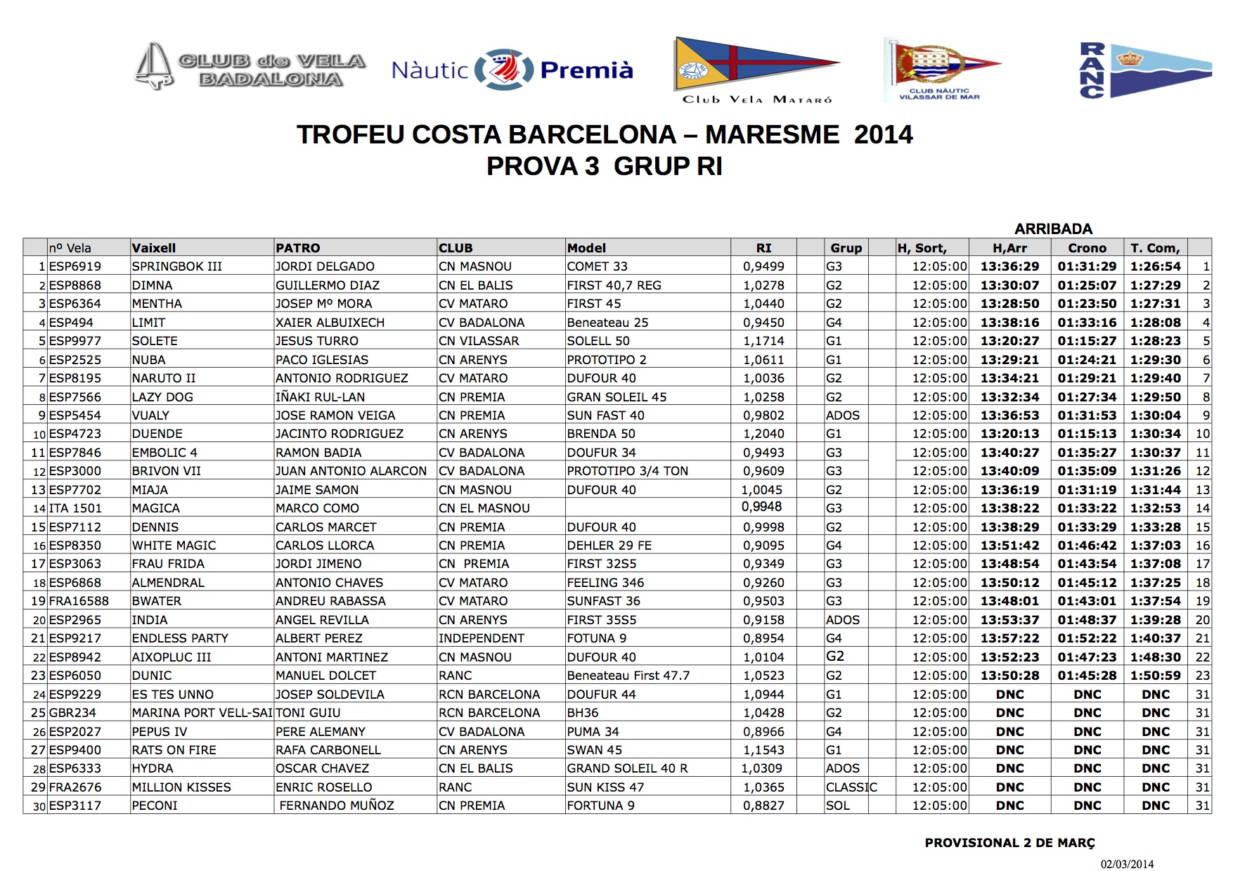 Ya està !!!! A la hora de hacer las clasificacines definitivas hemos tenido que rectificar ya que hay embarcaciones que se inscribieron en A2 iy luego han participado en trip. completa. No hay Grupo 4 en RI por no llegar a los barcos sufucientes inscritos en ese grupo. se mantiene Trip reducida en RI. curioso el dato que en Promocion la mayoria sea en trip reducida :adoracion: Total 46 embarcaciones inscritas. Dodifee no pudo participar por averia en Motor el primer dia. Million Kisses: No pudo tener la embarcacion lista para el evento, todavia sugue en varadero. Yagos. Mi intencion era poder participar en Vilasar Badalona <-->Badaona Mataró pero tenia el trofeo de Optimist i no podia dejar a mis niños. Estamos buscando fecha opara la entrega de los trofeos. General RI http://www.nauticpremia.net/images/i...0de%20marc.jpg RI por grupos http://www.nauticpremia.net/images/i...0de%20marc.jpg General Promo http://www.nauticpremia.net/images/i...0de%20marc.jpg Promo Reducida/completa http://www.nauticpremia.net/images/i...0de%20marc.jpg |