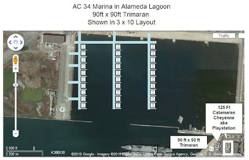 Un lugar donde casi todo está preparado para poder alojar a los participantes de la 34: la antigua Naval Air Station de Alameda, al sur de Bay Bridge, en el lado Este de la Bahía. En los otros sitios, tendrían que ponerse de acuerdo los políticos en hacer reformas, etc. Y habría que gastar mucho más dinero en construir edificios. Pero vaya usted a saber... La dársena tiene entre 14 y 16 pies de calado. Si se usan multicascos, hay agua suficiente. Por cierto, parece que el Bay Bridge tiene 220 pies (61 m.) hasta el agua, así que habría que "limitar" la altura de los mástiles... ;) Desde la Dársena de la NAS hasta el campo de regatas frente al Golden Gate hay unas 5 millas. Aquí tenéis una foto que superpone el mapa de Google con la carta marina. Es una captura de un portal muy útil que permite esto: http://marine.geogarage.com/routes/?...793457&zoom=14 http://lh4.ggpht.com/_E02Vc6phd5M/S8...nd%20image.jpg |