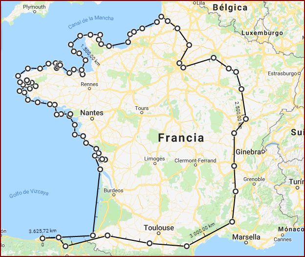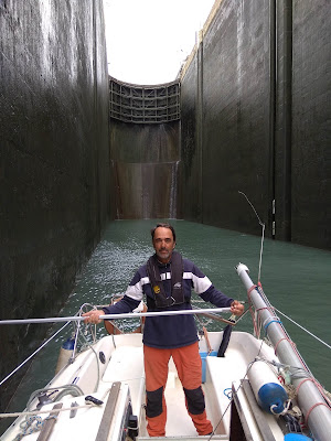 En primer lugar, la ruta realizada: Y ahora algunos de los mejores momentos: Abarloados al Joshua, de Moitessier, en La Rochelle (entrada del blog de 5-6-18): Pasando el Raz de Seine (entrada del blog de 17-6-18): Explorando el río Aulne, hasta Chateaulin (entrada del blog de 24-6-18): Dejando el nombre del Corto Maltés con la estela en las aguas de la rada de Brest (entrada del blog de 29-6-18): En La Rance, ese río frenado por una presa mareomotriz, que genera mareas artificiales ajenas a lo que sucede en el mar al otro lado de la presa, y saludando a Josefina (entrada del blog de 15-7-18): Entrando en la isla de Jersey, donde pisamos suelo inglés, y conociendo sus mareas de hasta 13 metros en vertical (entrada del blog de 17-7-18): Pasando el Raz Blanchard, sin ningún peligro pese a su mala reputación (entrada del blog de 20-7-18): Entrando en Paris después de un rodeo de más de 200 millas (entrada del blog de 11-8-18): Atravesando el túnel de Balesmes, navegando 5 km por el interior de una montaña a 340 metros sobre el mar (entrada del blog de 22-8-18): Entrando en Lyon, después de haber pensado en abandonar y haber seguido adelante (entrada del blog de 27-8-18): Pasando la mayor esclusa de Francia, 23 metros de desnivel (entrada del blog de 31-8-18): Otro día os pondré los momentos más deprimentes, que también los hubo. |