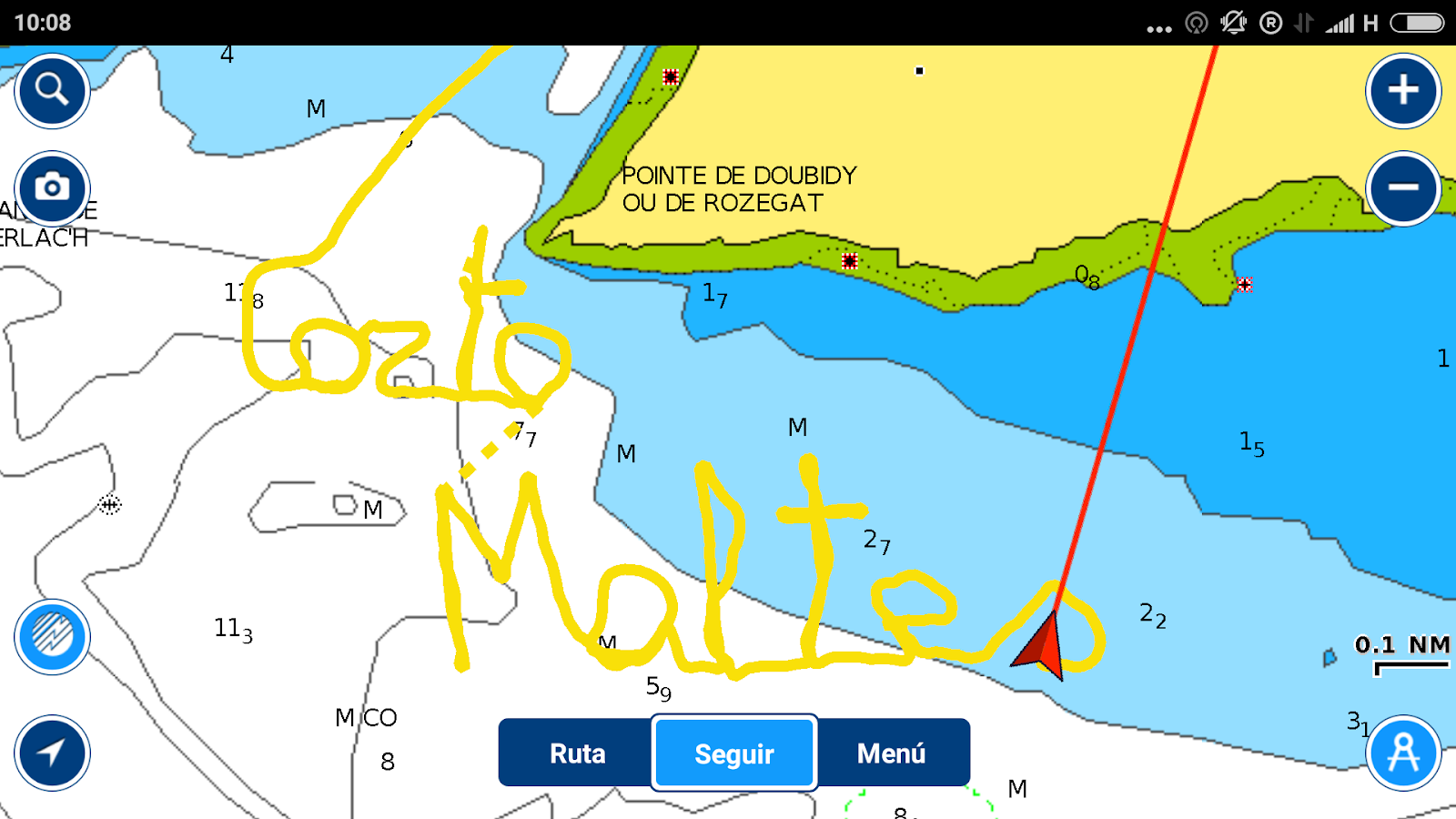 Hola navegantes. Después de otros acaecimientos, entre los que incluyo la exploración del río Trieux durante 3 días (fue el sexto río de este viaje, después del Charente, el Etel, el Goyen, el Aulne y el Elorn) llegamos al puerto de Daohuët. Está al fondo de un fiordo que se seca completamente en bajamar, y retiene el agua con un umbral. La entrada al fiordo es preciosa, una grieta en la costa mineral que desde el mar parece imposible que dentro haya ningún puerto. Era pleamar y ya dentro vimos un plano de agua liso, y en mitad de él un par de perchas roja y verde por entre las cuales teníamos que pasar, porque todo lo demás estaba obstruido por el muro sumergido, aunque no lo viéramos. Nos colocaron en el extremo del pantalán, muy cerca del umbral, lo que nos permitió apreciar muy bien el fenómeno que ocurrió más tarde. Nos acostamos dispuestos a dormir como marmotas en aquel abra de paz, pero cerca de la medianoche nos despertamos por un ruido sordo, que nos hizo saltar de la cama pensando que pasaba algo. Al salir con las frontales vimos que era el agua vaciándose por encima del umbral, que formaba como una cascada y eso, sobre un muro de 150 metros de largo, ¡vaya si suena!. Luego todo se serenó y dormimos hasta la madrugada. Teníamos que levantarnos a las 5 h., porque habíamos calculado que a las 5.30 h. habría agua suficiente para salir con la orza subida. Pues a las 5 h. el antepuerto estaba completamente seco con todos los barcos varados, desde nuestro atraque veíamos toda la entrada del fiordo en seco, y os lo prometo, parecía imposible que media hora después pudiéramos salir por encima de aquel muro. Pues mientras desayunábamos oímos otra vez un ruido como de una cascada y era la marea que estaba llegando y pasando por encima del umbral. Parecía esas imágenes del telediario de los tsunamis, de verdad. En lo que tardamos en recoger y prepararnos había alcanzado casi dos metros sobre el umbral y salimos sin ningún problema. Claro, en esa costa sube 10-12 metros en cada marea, lo que significa un metro en media hora de promedio, pero en las horas centrales metro y medio en media hora, y no estábamos acostumbrados. Fue una sensación hasta entonces desconocida. ¡Id con cuidado!. |