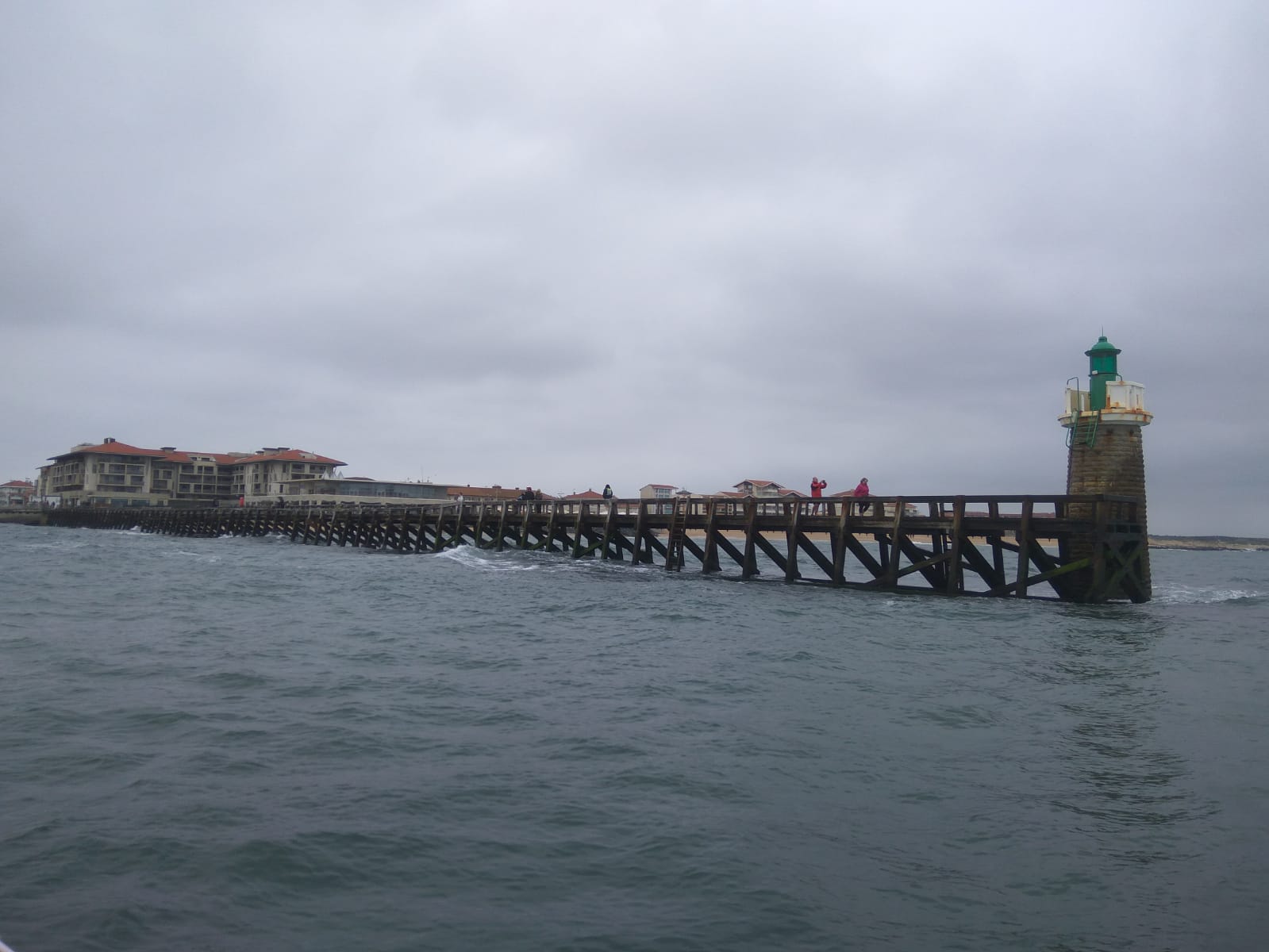 Hola navegantes. La travesía hasta Capbreton la hicimos lloviendo y con neblina como si estuviera corriendo el mes de enero. Tiene una entrada limitada por el calado (un metro y medio), lo que unido a las olas que suelen azotar su entrada hace que muchos días sea imposible entrar. El pueblo estaba desierto y desolado bajo una cortina de agua. Nos cerraron las tiendas y no nos dio tiempo a nada. La información sobre los ejercicios de tiro estaba expuesta en el tablón. Los había toda la semana, entre Capbreton y Arcachon, y el martes era el único día en que dejaban un pasillo de 3 millas paralelas a la costa para pasar (estábamos a lunes). Así que tuvimosque salir el martes a la fuerza, aunque nos pasarían los misiles por encima de la cabeza. Iban a ser más de 60 millas hasta Arcachon sin poder salirnos de ese pasillo, o 125 si no podíamos entrar en Arcachon y debíamos seguir al estuario del Garona navegando de noche. |