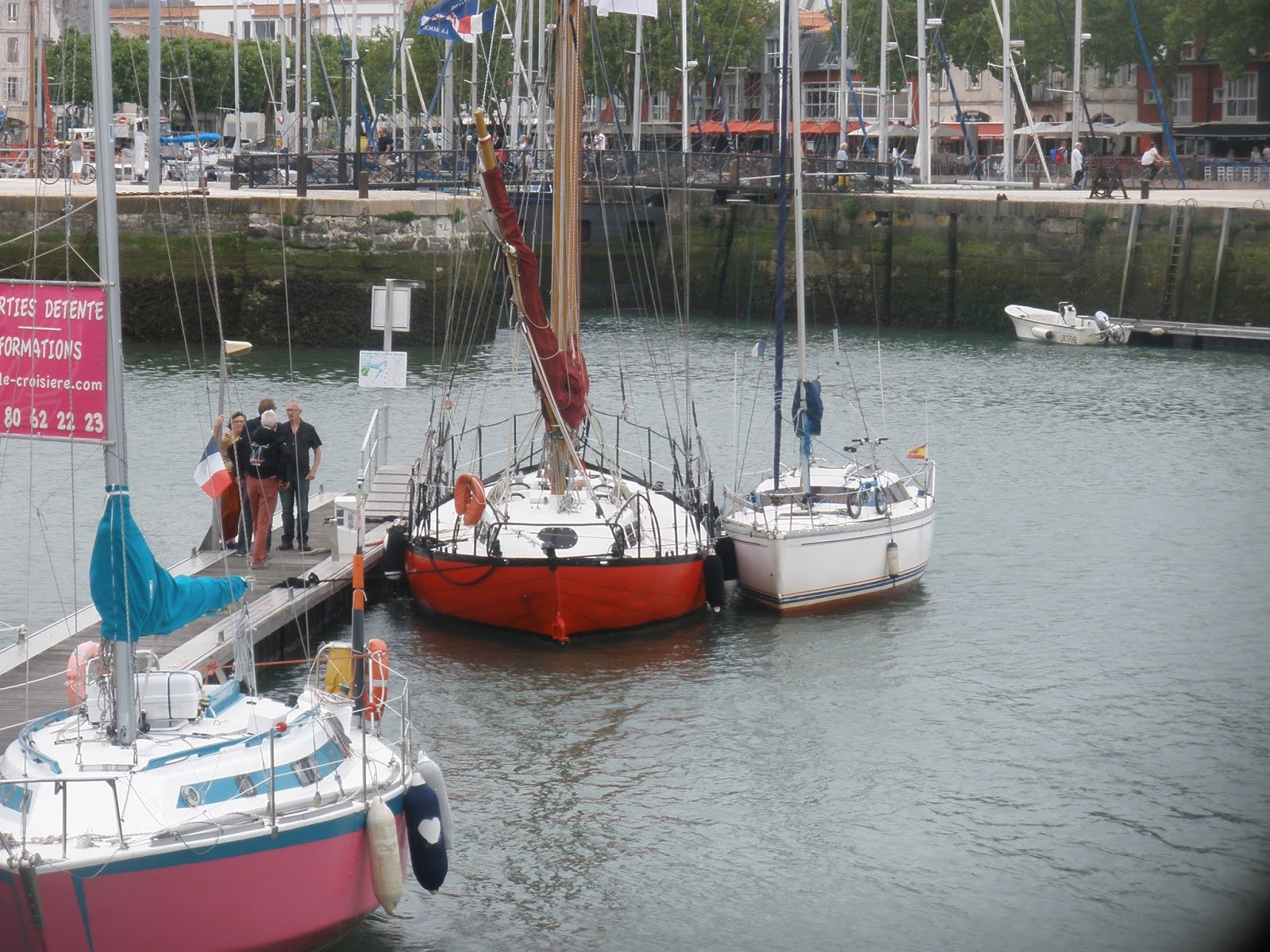 Hola navegantes. Después de otros acaecimientos, en los que que incluyo nuestro contencioso con los ejercicios de tiro del ejército francés y las dificultades para salir del estuario del Garona, llegamos a Rochefort. Fue un arsenal militar y está situado en el interior de un río protegido por numerosos fuertes en la desembocadura. Por estar tan lejos del mar sus tarifas son baratas y muchos veleros se quedan a invernar allí, y luego algunos de ellos se quedan ruinosos y abandonados. Se nos ocurrió cenar en un restaurante pegando al puerto, donde tardaron dos horas en servirnos. Todo ese tiempo estuvimos entretenidos filosofando sobre la vida de una pareja madura que vivía en uno de esos barcos ruinosos que he comentado. Era un catamarán y estaba lleno de trastos desordenados, de telas tapándolos, y tenía hasta andamios colgando por las bordas para acceder a las reparaciones por el exterior de los cascos. Tenían una hijita de unos 10 años mas aburrida que qué, a la que habían hecho un pequeño columpio colgado de la botavara, y fuera, en el puerto, sus tres bicicletas para los desplazamientos. Obviamente se habían establecido en aquella ruina intentando restaurarla, pero por la edad canónica de la pareja y los compromisos que les habría creado tener esa hija era evidente que no soltarían amarras nunca. ¡Qué pena esos sueños truncados!. Seguramente ellos se veían dando la vuelta al mundo, nosotros sólo podíamos ver aquella vida en pantuflas. |