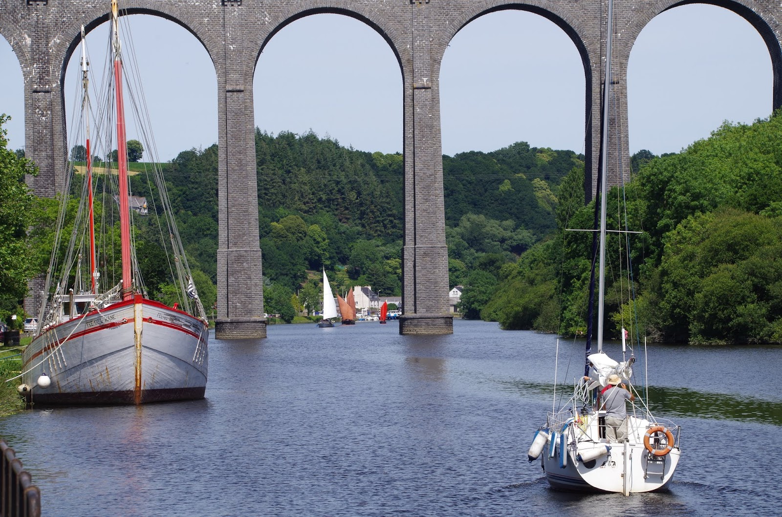 Hola navegantes. De Douarnenez fuimos a Camaret y luego a Brest, donde estuve con Ana dos semanas recorriendo esa inmensa bahía (la Rada de Brest), un auténtico mar interior con 350 kilómetros de costa. En su interior desembocan cinco ríos que forman su correspondiente estuario, si bien sólo son navegables dos, el Aulne hasta Chateaulin y el Elorn hasta Landernau. La rada está muy protegida de los elementos (que allí proceden sobre todo del Oeste) por su estrechísima entrada, de una milla de ancho, que a su vez provoca corrientes de marea de hasta 7 nudos. Una de las excursiones más bonitas fue la del río Aulne hasta Chateaulin, 31 millas tierra adentro.Se pasa por muchos campos de boyas en el estuario de los otros ríos, dos instalaciones militares (una base de submarinos y una Escuela Naval), un cementerio de barcos, algunos puentes y finalmente la esclusa. Al final abocamos a un puente seguido de un salto de agua con una pequeña esclusa, donde ya no podíamos avanzar más sin desarbolar, y vimos a estribor un único pantalán enano, doblado y oxidado, ocupado por dos barcos, y otros dos amarrados al muelle de piedra. Nos extrañó porque nuestras guías indicaban que había sitio para 30 barcos. Nos enrollamos con el capitán de uno de los barcos, más pequeño que el Corto Maltés, tan pequeño que casi todos los cacharros de cocina y los cubos, lavavajillas y demás los tenía esparcidos por la cubierta. Nos contó que pasaba largas temporadas en Chateaulin porque vivía a bordo y aquél sitio era gratis, y que efectivamente hubo allí 6 pantalanes pero que en 2010 un temporal destrozó cinco de ellos. Sólo habían quedado las ruinas que ahora veíamos del sexto y nadie se había molestado en reponerlos. Nos impresionó pensar que 31 millas tierra adentro también allí los temporales de Bretaña tuvieran esa violencia. Decidimos quedarnos abarloados allí para aprovechar la electricidad y el grifo. El calor era asfixiante y aquél enchufe era la diferencia entre poder ventilarnos y tener comida fría, o no tener nada. Estuvimos en Chateaulin 3 días. |