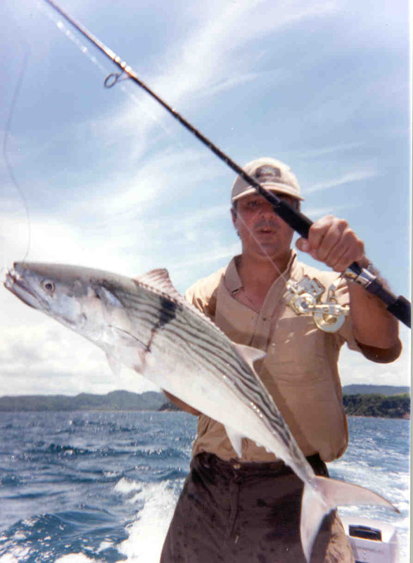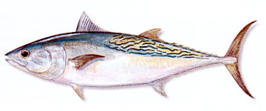 Bueno, ahora le toca el turno al del pijama a rayas. EL LISTADO <<Al igual que todos los peces de la familia de los Túnidos, el Listado tiene un cuerpo fusiforme y fuerte, sus dientes son cónicos y pequeños, la circulación sanguínea periférica es muy intensa, su temperatura corporal es más alta que la del medio que le rodea y sus aletas dorsales suelen estar contiguas ó muy cercanas, pero nunca separadas por una distancia igual ó mayor que la base de la primera dorsal. Tiene unas bandas ó listas longitudinales que le recorren toda la zona ventral, de ahí le viene su nombre. Estas bandas suelen ser en número de 4 a 6 por cada lado del vientre y tienen un color parduzco. Cuando los individuos están vivos éstas bandas no son demasiado evidentes. Se oscurecen y son más notorias en los ejemplares muertos. Este Túnido pertenece, en unión de la Bacoreta, al género Euthinnus establecido por Lütken en 1881, el cual encuadra a peces de talla intermedia entre las especies del género Thunnus y las de Auxis, es decir, entre el Rabil y el Patudo por una parte y las Melvas por la otra. Las escamas se localizan solamente en el corselete, quedando desnudo de ellas todo el resto del cuerpo. La primera aleta dorsal tiene el borde netamente cóncavo y está separada por un estrecho espacio de la segunda. Una característica interna de éste género es la de carecer de vejiga natatoria, de ahí que no sea muy dado a descender a grandes profundidades, lo cual tampoco significa que no sea capaz de hacerlo. Por ejemplo, puede descender a 260 metros como máximo en poco más de un minuto si hay algo que le asusta. Alcanza los 40 kilómetros por hora de velocidad punta, lo que no está nada mal teniendo en cuenta su contenida talla. Dentro del género Euthinnus está clasificado en el subgénero Katsuwomus establecido por el japonés Kinshinouye en 1923. Su nombre científico completo es Katsuwomus Pelamis. Se caracteriza éste subgénero por no tener dientes en el vómer ni en los palatinos, por el descenso brusco de su línea lateral a la altura de la segunda aleta dorsal y poseer más branquispinas que las especies del otro subgénero, representado en nuestras costas por la Bacoreta (Euthinnus Alletteratus). Se distingue fácilmente de la Melva, por tener ésta las aletas dorsales muy separadas. De la Albacora porque las pectorales de ésta sobrepasan la segunda dorsal. El Listado se diferencia de la Bacoreta en que ésta tiene de 3 a 8 manchas redondas y casi negras como grandes lunares a ambos lados del pecho, y otras manchas sinuosas en los dos tercios posteriores del dorso, pero no tiene bandas oblicuas longitudinales algo inclinadas en el vientre. Finalmente se distingue del Bonito del Sur en que éste tiene sus bandas recorriendo el dorso, mientras que en el Listado recorren su vientre como ya he dicho antes. La sección central de su cuerpo es cilíndrica. El descenso de volumen es bastante brusco hacia el pedúnculo caudal, esto es más acusado cuanto más grande sea el individuo, de ahí que a los mayores se les denomine Barrilete por razones obvias. Su hocico es corto y los ojos de tamaño mediano. La boca es más bien pequeña, y los dientes muy reducidos en las mandíbulas y en la faringe. La lengua tiene un reborde en cada lado. La particularidad de que tenga más branquispinas (entre 53 y 63) y más largas que los demás peces de su familia es un claro indicativo de que uno de sus alimentos es el Plancton, esto está comprobado que es así, pero no solamente mientras son juveniles como en las demás especies de Túnidos si no también cuando son adultos. El Listado tiene el cuerpo fusiforme, muy panzudo, de talla mediana y con el pedúnculo caudal provisto de crestas y quilla. Ya se ha dicho que solo tiene escamas en la parte anterior del tronco, formando ese escudo característico en muchos escómbridos al que se le denomina corselete ó peto. Su talla más habitual es de entre 50 y 65 centímetros con un peso de 2 a 4 kilos, pero de viejos miden casi un metro y pesan 15 kilos, éstos ejemplares son frecuentes en la costa oriental del Brasil y en el Océano Pacífico. El pesquero de bajura de Bermeo denominado “Urengoy” capturó en verano de 1972 al Oeste del Cabo de Finisterre y con aparejo de curricán ó cacea, un ejemplar de 110 cm que arrojó en báscula un espectacular peso de 26 kilos, pero parece ser que se han llegado a capturar ejemplares de hasta 32 kilos. Su primera aleta dorsal tiene de 14 a 16 radios espinosos. La segunda dorsal y la anal son triangulares, opuestas en su colocación y muy parecidas entre sí. La caudal al igual que sus parientes es semilunar y muy fuerte. Las aletas pectorales son muy cortas y poseen 26 ó 27 radios espinosos. El número de vértebras es de 41. Las pínulas, en número de 7 a 9, son también muy pequeñas y semitransparentes, aunque dotadas de movimiento propio. Su dorso es azul oscuro con reflejos verdosos o añil, los flancos y el vientre son plateados, más bien de un tono a zinc, y están recorridos a cada lado por 4 a 6 bandas de color pardo, que empiezan detrás del corselete y terminan justo antes de la raíz de la cola. Estas bandas son más cortas en la parte superior y se alargan a medida que recorren las partes inferiores de la región ventral. Curiosamente las listas o bandas parduzcas no son visibles en individuos vivos, por el contrario comienzan a hacerse evidentes mientras agonizan y quedan perfectamente marcadas con su característico color parduzco una vez muertos. El Listado habita en todos los mares cálidos y templados del globo, es muy pelágico y se acerca con no mucha frecuencia a la costa, por lo que recibe el apelativo de Bonito de Altura. Únicamente en verano y en determinadas épocas, se aproxima algo al litoral, para regresar pronto a alta mar. En numerosas ocasiones llega a adentrarse en el Mar Cantábrico hasta la costa francesa. Se conocen casos en los que incluso se han capturado Listados en