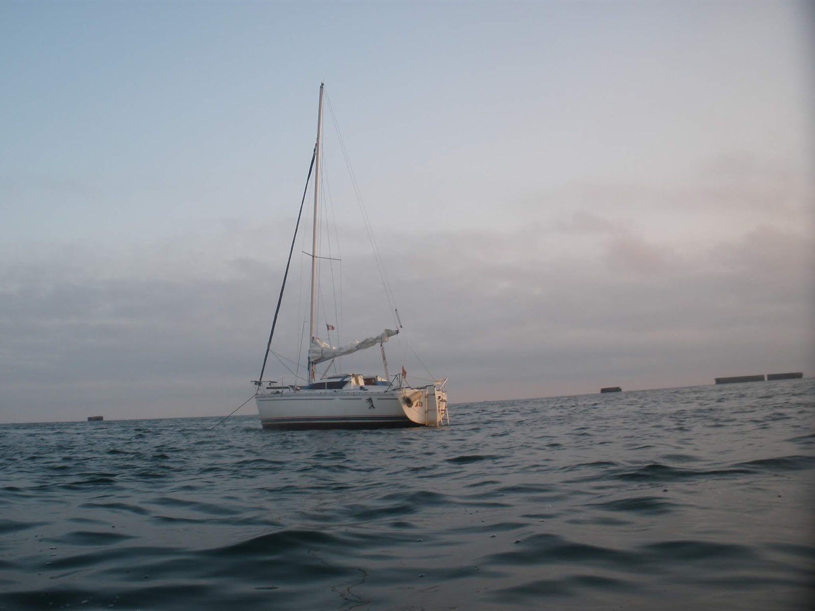 Hola navegantes. De Jersey fuimos a Guernsey, y unos días después pasamos el Raz Blanchard. Elegimos bien el momento y la que iba a ser una de las navegaciones más difíciles de la vuelta a Francia fue una de las más divertidas y tranquilas, a una velocidad endiablada (picos de más de 10 nudos) pero siempre confiados, lo que se suele llamar una navegación de señoritas. A mis amigas no les gusta la expresión, pero menos les gustará este cartel que vieron los de “Voiles et Voiliers” en Alderney, la isla que cierra el Raz Blanchard: SE BUSCA BUENA MUJER. Debe saber limpiar, cocinar, coser, insertar gusanos y limpiar pescado. Debe tener barco y motor. Por favor enviar foto del barco y del motor. Ironías machistas aparte, ya comenté que suele pasar en la náutica: tanto hablar de los peligros acabas creyéndotelos y preocupándote por ellos, como un perro que se asusta a sí mismo ladrándole a un espejo. Y eso es el Raz Blanchard. En Cherburgo cambiamos de tripulación, se incorporó mi amigo David Calvo, y al cabo de unos días llegamos a Arromanches. Allí ya no existe nada que recuerde a un puerto, sólo los restos del desembarco aliado. Os lo conté en el blog el 25-7-18 y os recomiendo volver a leerlo. Los pocos bloques que aún se ven están dispersos, en una línea discontinua, y no protegen en absoluto. Aun así en algunas cartas náuticas siguen catalogándolo como “Port Winston” y puede inducir a error. Y por si fuera poco, en el interior del “puerto” hay varios naufragios, y el fondo está plagado de diversos residuos bélicos que complican el fondeo por la facilidad con que las anclas se traban. Nos apetecía tanto conocerlo que nos arriesgamos, aun sabiendo que pasaríamos una noche de las malas. El sitio era de los que luego se te meten en los sueños: el anochecer con aquella luz crepuscular, el sol poniéndose entre los bloques abandonados, saber que te rodean naufragios heroicos, la misma incertidumbre de la noche que teníamos por delante y su sobreabundancia de adrenalina... Y en efecto la noche fue de las de dormir con un solo ojo, y no descansamos nada. Por si fuera poco al intentar desembacar casi se me lleva la corriente, y al levantar el fondeo la maldita ancla se había enrocado. A pesar de ello mereció la pena, nos trajimos un recuerdo precioso, y la dibufirma y las fotos crepusculares del Corto Maltés en lo que queda de Port Winston las considero un homenaje a aquellos valientes que libraron a Europa del fascismo. ¡Con cuidado!. |