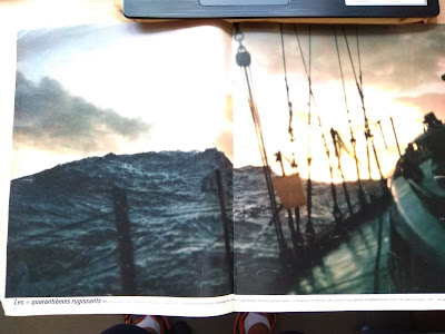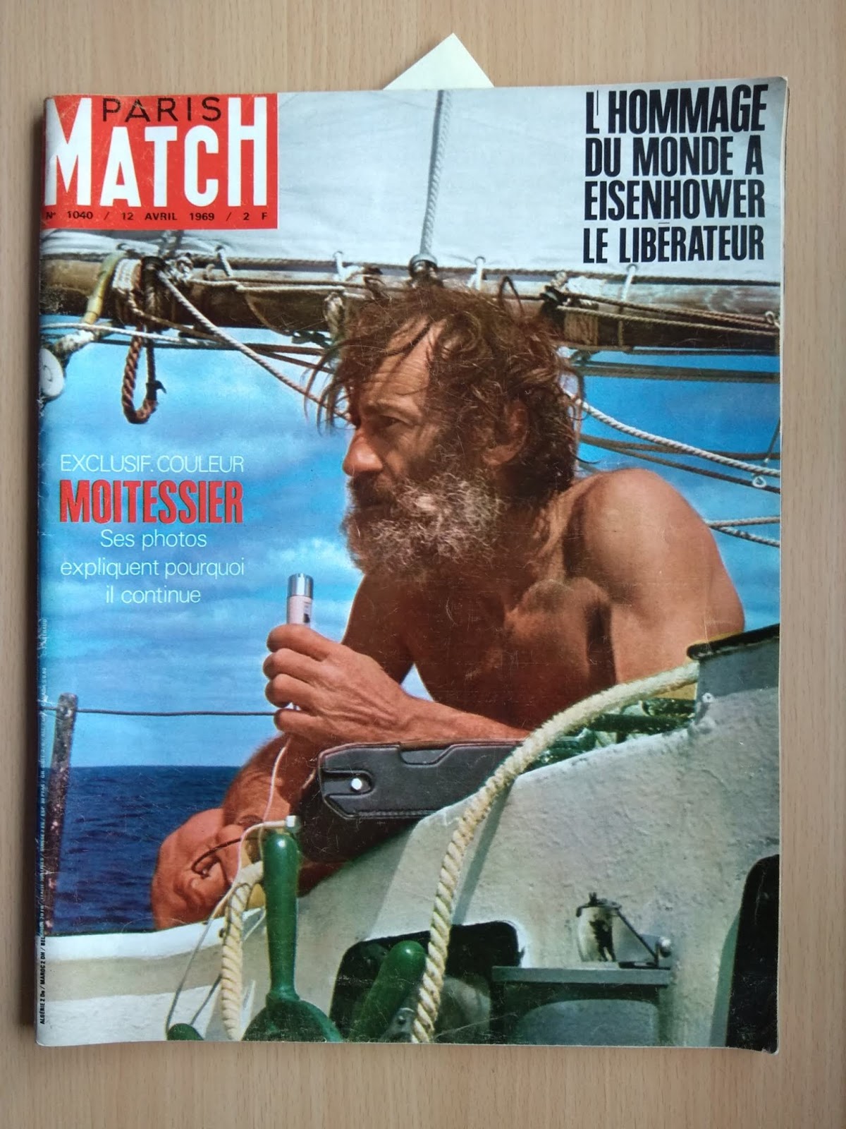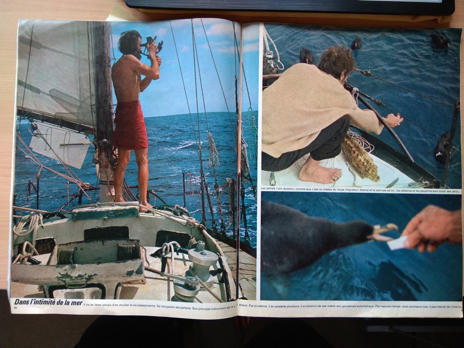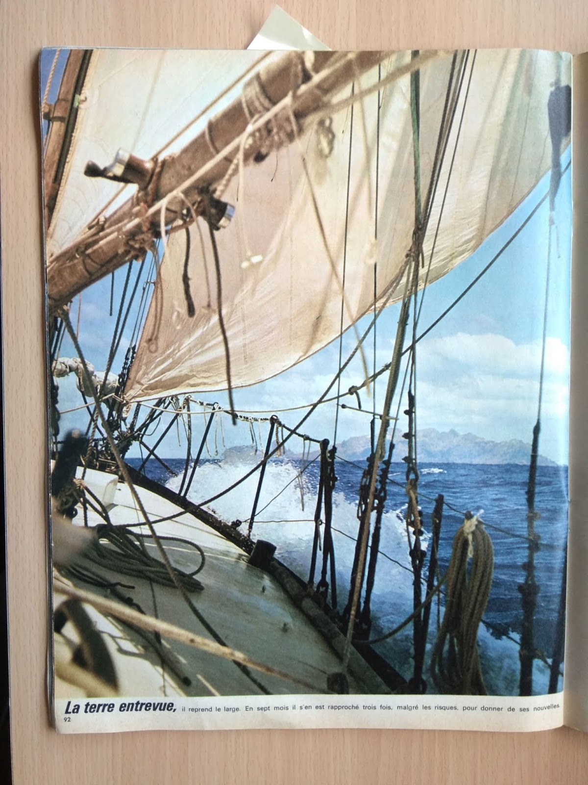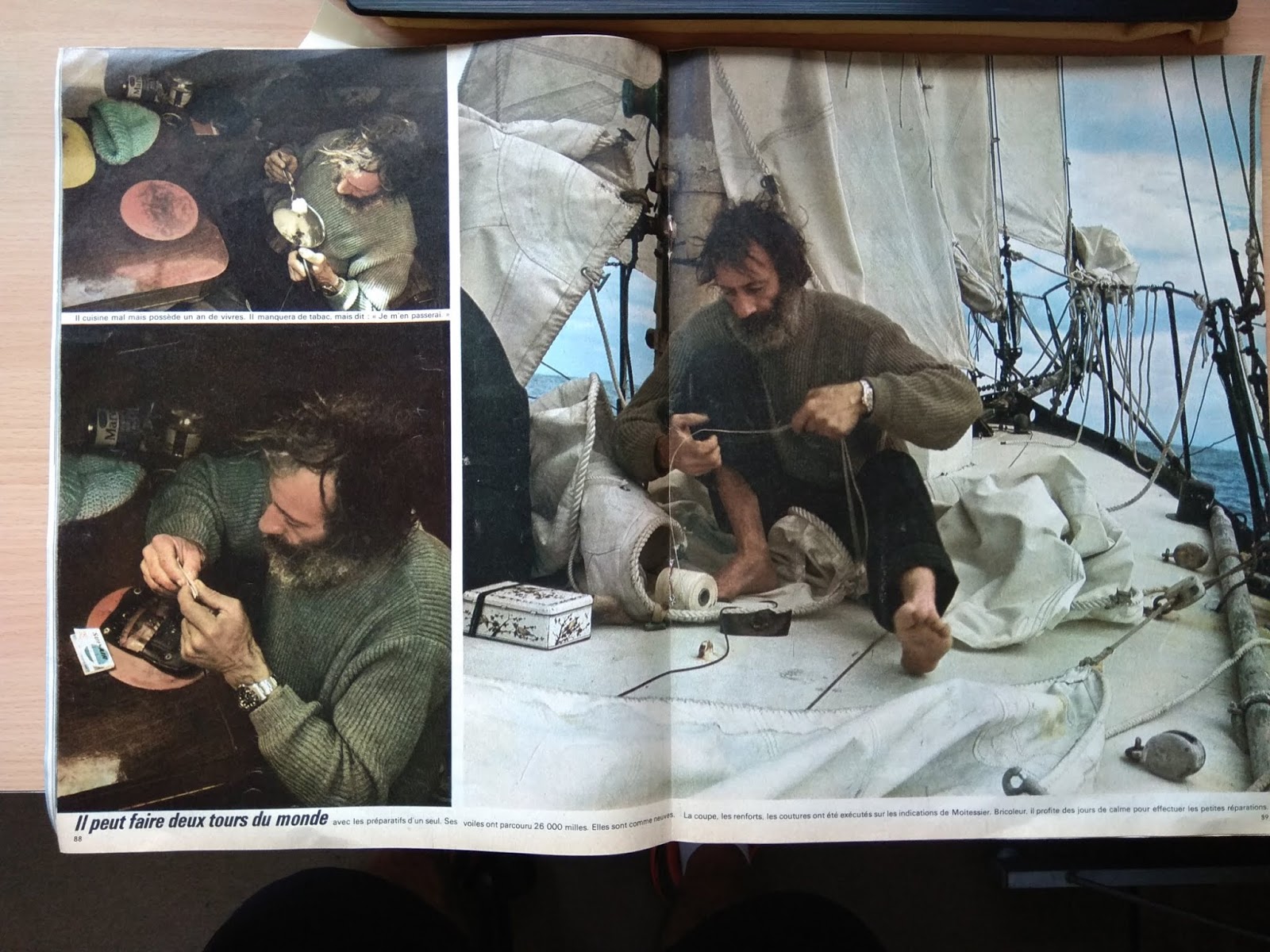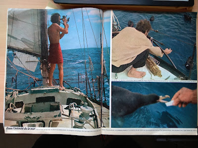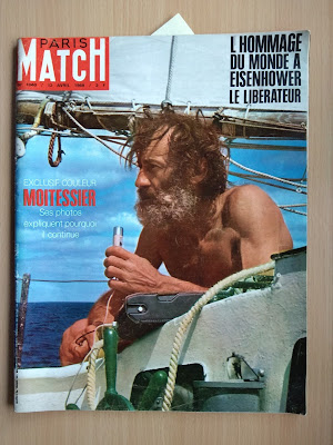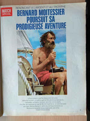 He conseguido la revista Paris Match de abril de 1969, donde se supone que Bernard Moitessier contaba las razones profundas de su abandono de la Golden Globe cuando iba vencedor, por no volver a Europa y seguir su navegación hasta la Polinesia, dando una vuelta y media al mundo: En la portada se le ve dictando a una casete de las antiguas las frases de una conversación imaginaria que cita en su libro "El largo viaje": "He charlado un buen rato con mis amigos. Varias casetes repletas de cosas. De todas las cosas. Lo bueno y lo malo, los temporales, las puestas de sol, las gaviotas, los delfines, el Hornos, la soledad, el amor también. Las cosas simples del mar donde englobo a todos los hombres, en las que lo rechazo todo en bloque. Sin renegar del hombre". En la portada de la revista esta frase de reclamo: "Exclusiva: Moitessier, sus fotos explican por qué continúa". Tenía mucho interés en ver si aportaba algo nuevo a su enigmática frase, la que se cita siempre y recoge en el mismo libro, y que envió al Sunday Times, el periódico que organizaba la regata, desde el Cabo de Buena Esperanza: "Sigo sin escala hacia las islas del Pacífico porque soy feliz en el mar, y quizás también para salvar mi alma". Pues la presunta exclusiva del Paris Match decepciona un poco. Se limita a reproducir algunas de las fotos que envió desde Buena Esperanza con unos pies de foto escritos por Jean-Michel Barrault, que al parecer escuchó las casetes que comentaba antes. Para no pecar de subjetividad os reproduzco el reportaje entero y los pies de foto traducidos. Que cada uno saque sus conclusiones. Parid Match está orgulloso de poder ofrecer en su número un cuaderno especial con fotos tomadas por el navegante solitario, lanzadas, como una botella al mar, al pasar por Buena Esperanza, y comentadas por Jean-Michel Barrault, gracias a las grabaciones donde Moitessier charla largamente con sus amigos. Los "cuarenta rugientes". En si libro "Cabo de Hornos a vela" había escrito: "Guardaré siempre la nostalgia de esta mar gigantesca, fantásticamente bella". Renuncia a la tentación de los alisios y se queda en las tempestades de otoño del hemisferio austral. Dice: "esto será duro". Puede dar dos vueltas al mundo con los preparativos de una sola. Sus velas han recorrido 26.000 millas. Están como nuevas. El corte, los refuerzos, las costuras, han sido ejecutados bajo las indicaciones de Moitessier. Aficionado al bricolaje, aprovecha los días de calma para efectuar pequeñas reparaciones. En la intimidad del mar, no deja jamás de estudiar la vida apasionante. Su navegación es perfecta. Su principal instrumento es el sextante. Por prudencia posee varios. Ha construido con sus manos un piloto automático. Con mal tiempo, con todos los tambuchos cerrados, puede gobernar desde el interior. Los petreles le han reconocido. Como ellos, es un pájaro de mar adentro, migrador eterno, y el viento es su ley. Los albatros y los delfines son también sus amigos. Entrevista la tierra, vuelve a mar adentro. En siete meses se aproximado a ella tres veces, pese a los riesgos, para dar noticias. Eso es todo. |