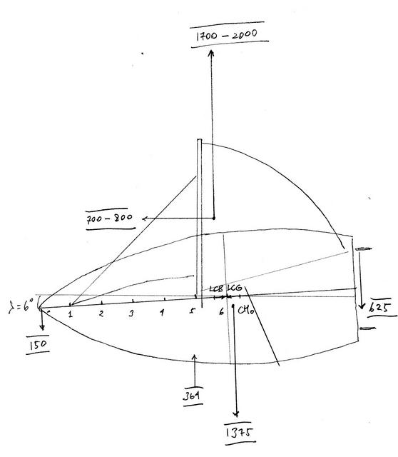 (28 nudos de viento aparente, ¿verano del año 2024? Cabo de San Vicente por estribor, Fuerzas en Newtons) pues esto ya está tabla de surf pequeñaja cabinada y capaz de cenir bien sale mucho mejor de lo esperado, que es lo bueno de no hacerse trampas al solitario y empezar con estimaciones muy prudentes e incluso pesimistas ciñe a 45 grados del viento real con 6 grados de abatimiento; pero la Fuerza de avance es mayor que la resistencia calculada con 2,57 metros por segundo (5 nudos) así que el botecito acelerará e intentará toparse con el muro de resistencia que hay en 6 nudos y los apéndices producirán más Fuerza, como el botecito de Tamara, Angela y Sofia entonces la cosa queda 24 metros cuadrados de Spi en su botalón orientable 7 metros de Foque en su botavara 14 metros cuadrados de Mayor en su botavara el palo está en 5, en el 50% de la línea de flotación la Cuaderna Maestra está en 6, y está en 6 desde hace ya ¿70 años? Sí hace ya un porrrón de años que en los veleros la Maestra se fue de 5 a 6 la Fuerza del Viento está justo encima de la zona por donde se mueve la posición longitudinal del Centro de la Carena (LCB) Y el Centro Hidrodinámico de la Orza (CHo) está justo debajo de la zona por donde se mueve la posición longitudinal del Centro de Gravedad (LCG) la Fuerza del Viento cruza a popa del Centro de Gravedad y, por tanto, el velerito navega solo sin piloto la primera vez que navegué en un velero que navegaba solo fue hace un porrón de años, con un Bilbaino, esto de bilbaino le pega una B así grandota, pues trincamos la rueda a la altura del Cabo de San Vicente y el barquito nos llevó jugando el solito con las olas y el viento hasta Fisterra exagerando un poco claro aquello se me quedó gravado en el alma |