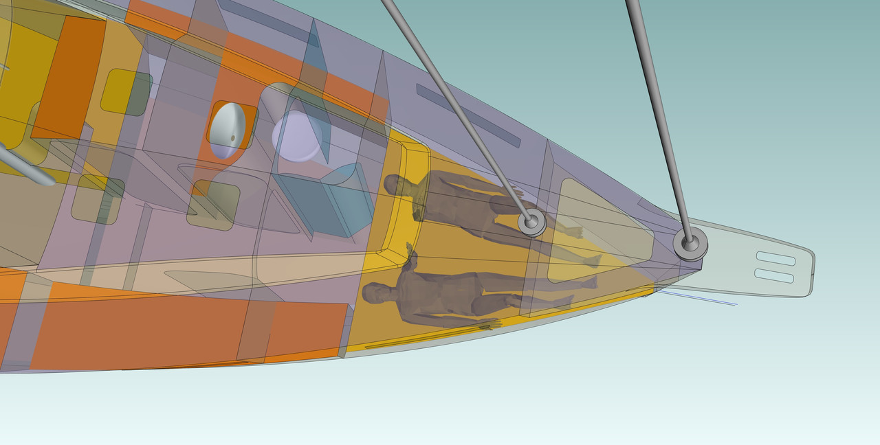 El baño no se suele poner en la proa debido a la altura. Es muy difícil tener altura suficiente en una zona a la que no suele llegar la cabina. Y no es muy bueno que llegue porque el triángulo de proa en cubierta es mejor que sea plano para maniobrar con las anclas, amarras y en posibles cambios de vela. En el SF 3200, barco basicamente de regatas y no de crucero, el baño claramente no tiene altura y es simplemente una manera de hacer el baño en el sitio que afecte menos al resto del interior. En el Pelícano, que tiene un considerable francobordo en proa (1,50 m), la altura interior cuando acaba la cabina es de 1,83 sin contar con el grosor de cubierta y refuerzos y la superficie de suelo ya es bastante pequeña, a pesar también de las potentes formas de proa. Sería posible, pero nos ha parecido más holgado situarlo un poco más a popa y dejar ahí una litera de 2,30 m x 1,85 en la que pueden dormir de manera amplia dos adultos, sin que importe tanto la altura interior. Bajo la litera de proa se aprovecha además el primer metro de proa para hacer un mamparo de colisión. Por otra parte, uno de los deseos con este diseño es el de mantener en lo posible la sensación de espacio interior, y desde el salón se puede ver el espacio hacia proa libre en la banda de babor y el cierre del camarote de proa se plantea como opcional, de modo que se pudiera ver de proa a popa desde la entrada hasta la litera de proa. Plantear cuatro literas dobles en un barco de doce metros es seguramente exagerado, muy bien debieran llevarse cuatro parejas, o dos parejas y cuatro niños para convivir en el reducido espacio de un barco mucho tiempo, pero tener la posibilidad de meter esas 8 personas (o alguna más usando la dinette), para alguna situación puntual creo que es muy útil, y el resto del tiempo pueden tener otro cometido, para almacenaje de objetos voluminosos (una bici, botellas de buceo..) o para hacer otro baño o un taller en estribor a popa, lo que pueda precisar cada uno.. Un saludo :brindis: |