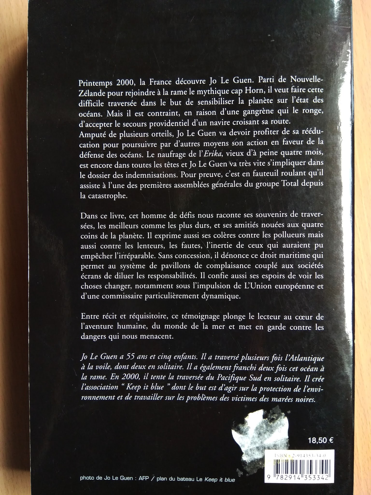 https://1.bp.blogspot.com/-uPUW3t68T...103_090544.jpg https://1.bp.blogspot.com/-qVGJFP6TY...103_090611.jpg La portada es tan negra porque mientras estaba en la silla de ruedas convaleciente de la amputación de los dedos en el intento de pasar a remo el Cabo de Hornos, se implicó en las reclamaciones contra el vertido de petróleo del petrolero Erika. Con cuidado, navegantes. |