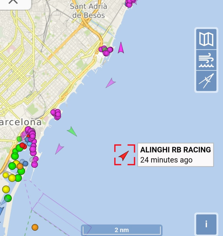 hola amura61 normalmente salen a entrenar los días que hay previsión de SW garbí suave, (previsión en windguru, Barcelona) en estas fechas los garbís son bastante escasos si coincides con un día de entreno, podrás situarlo con la web ¨vesselfinder¨ https://www.vesselfinder.com/ el barco se llama Alinghi RB Racing sale remolcado desde cerca del port vela su base y suele navegar delante de Barcelona aunque alguna vez se desplaza hacia Castelldefels con suerte lo verás un poco lejos de la costa :barcopapel: suerte |