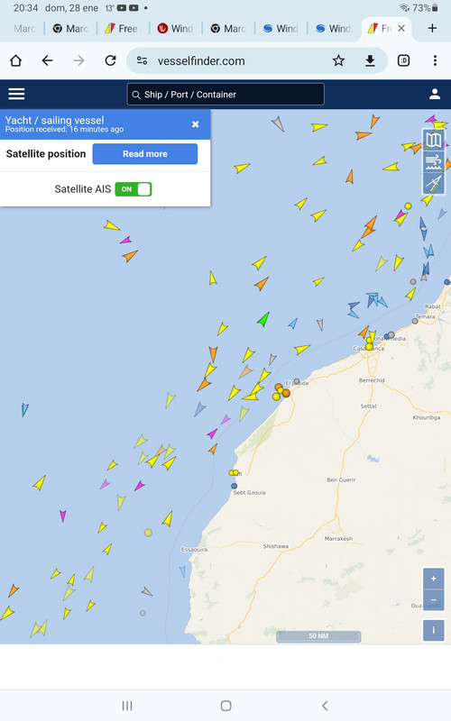 estos días repasando el movimiento de veleros que van hacia el estrecho de Gibraltar desde Canarias en el vessel finder, tan sólo se ve un velero que va hacia el NE, pero que no pone su nombre (color fucsia) Los vientos estos últimos días han sido flojos del SE (12kn) en la zona de fuerteventura, para mañana y pasado los vientos casi serán nulos :barcopapel: https://i.postimg.cc/hPRwTpB3/Screen...-28-203445.jpg |