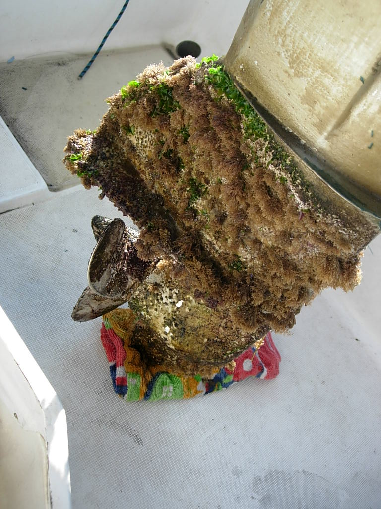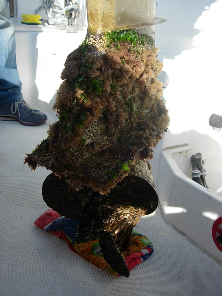 Hola Impulses. Mi barco, el Corto Maltés, tiene el fueraborda en un pozo, y por eso la cola está permanentemente en el agua. Habitualmente lo saco cada 3-4 meses para darle una patente especial de colas de fueraborda. Una vez decidí no darle la patente a ver qué pasaba y en 3-4 meses salió así: El barco está en Santander. Un saludo. |