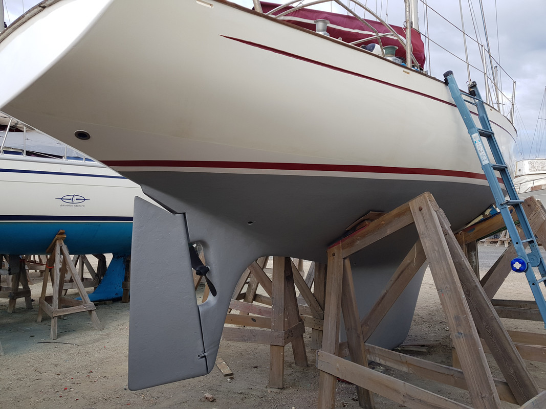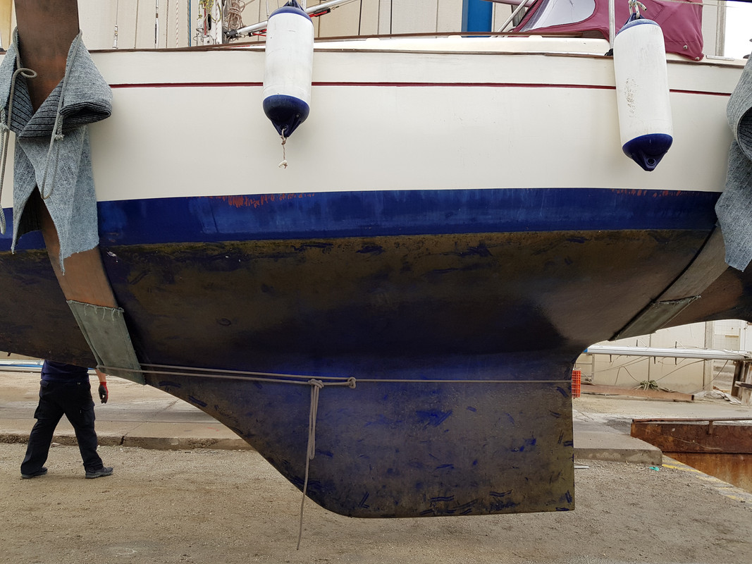 El casco no tenía ningún síntoma de ósmosis, pero ya que estaba fuera, decidí quitar las 100 capas de patentes antiguas y dar un tratamiento antiosmosis y dejarlo listo para unos añitos más.