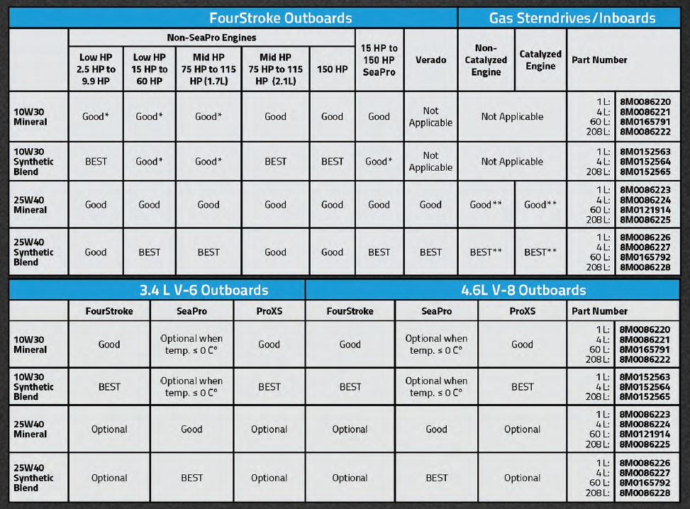 Son los distintos tipos de aceites de Quicksilver que Mercury recomienda para cada motor o aplicación. Los asteriscos son por motivos de temperatura ambiental (zona muy cálidas o zonas muy frías) donde se deriva al manual de cada motor. Es decir, si pone "Good*" en principio es válido, pero debe verse el manual del motor según la zona de temperaturas donde se usa para ver si es apropiado. "Best" es el mejor que se puede usar y luego hay algunos casos en los que no aplica o es opcional por temperatura de la zona de uso.. https://i.postimg.cc/ncV7pRwY/Captur...-23-095852.jpg En cuanto a cuando cambiarlo se recomienda "invernar" la embarcación con el aceite cambiado. Cierto es que los aceites se "estropean" en contacto con el aire, pero no en 2, 3 o 4 meses que el barco se quede parado. En caso de "invernar" el motor hay otros tratamientos que hacerle. Lo mejor es poder encenderlo una vez cada 15 días o cada mes. El mejor "invernado" es que no deje de funcionar. |