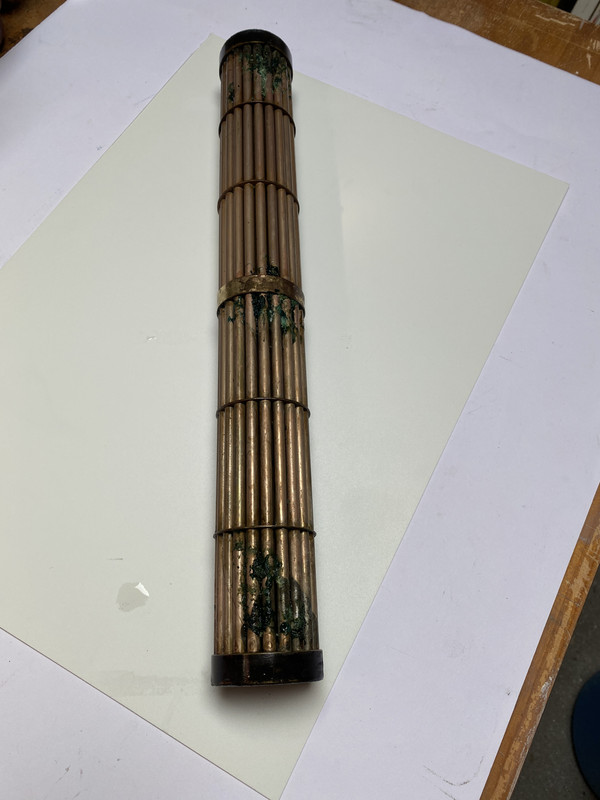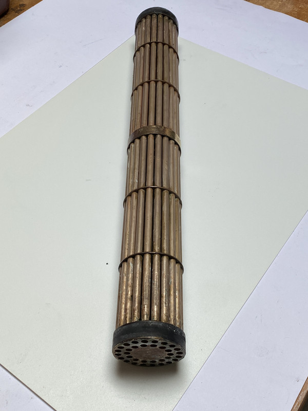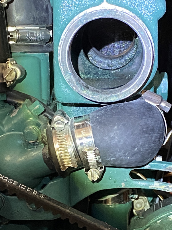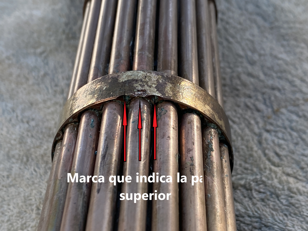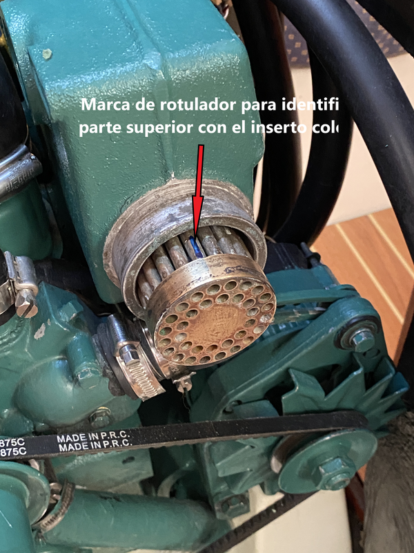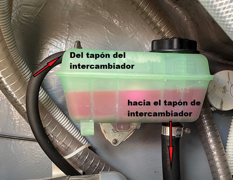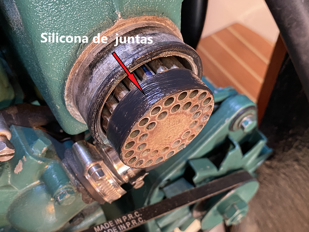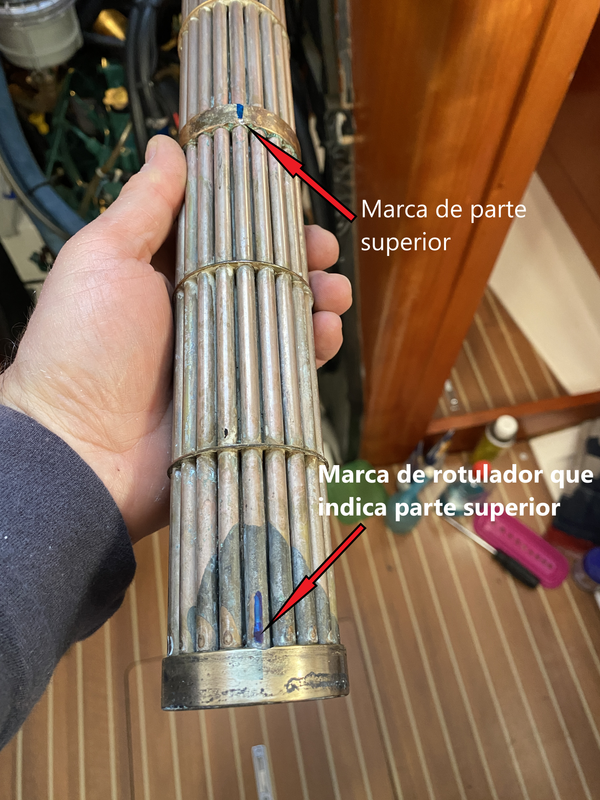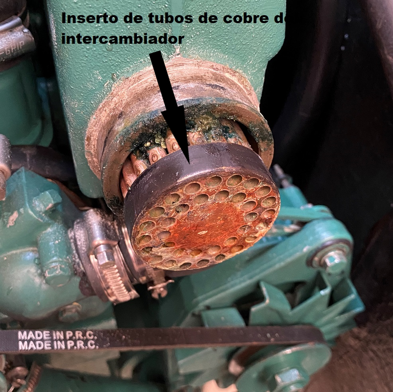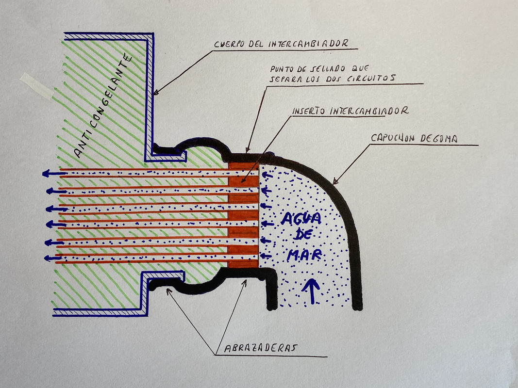 Desmontado y limpio la última vez en septiembre de 2018, es decir, hace cuatro años y seis meses. Limpieza del circuito de agua salada con vinagre en abril 2021, hace dos años. Hay productos en el mercado para limpiar el circuito del refrigerante, aunque yo nunca los he probado. Aquí se va a describir como realizar la limpieza física desmontando el intercambiador. Se aflojan las dos abrazaderas de cada uno de los capuchones de goma delantero y trasero del intercambiador. En el trasero se afloja también la abrazadera que une el capuchón al codo de escape. Se retiran los dos capuchones con cuidado de no forzar los terminales del inserto de tubos interior. https://i.postimg.cc/9fdTGC5r/IMG-5913red.jpg Tener en cuenta no intercambiar los capuchones, el que estaba en la zona anterior se debe de volver a montar en la zona anterior para que asienten mejor. No utilizar destornilladores o similares introducidos entre el cuerpo del intercambiador y la goma del capuchón porque se pueden dañar las superficies internas del inserto y del capuchón, que son las que procuran la estanquidad. Si alguna vez se rompió una pala del rodete de la bomba de agua de mar, lo encontrareis casi seguro dentro del capuchón delantero al que llega el agua de mar desde la bomba. https://i.postimg.cc/157KtmsS/IMG-0632red.png Retirar el inserto por la parte delantera del intercambiador procurando no forzar la unión de los tubos de cobre con los cabezales. Se puede girar hacia ambos lados para facilitar la salida si estuviese algo agarrotado, mientras se empuja por la parte trasera. Por el interior de los tubos de cobre circula el agua de mar y por el exterior de los mismos el líquido refrigerante. El cobre es un muy buen conductor térmico. El interior de los tubos, que fueron limpiados con vinagre dos años antes, estaban perfectamente limpios y libres de cualquier incrustación. No necesitan ninguna acción de limpieza. Si fuese necesario limpiarlos, se puede hacer con una varilla de diámetro adecuado a la que se le matan los ángulos del extremo para que no dañe los tubos. En el exterior de los tubos había algunos depósitos de anticongelante solidificado en la parte que estaba hacia arriba. La parte inferior apenas tenía residuos. Con un alambre se sacan hacia el exterior los residuos que hay entre los tubos (son blandos y salen fácilmente). Se limpia todo el exterior frotando con un cepillo de las uñas debajo de un chorro de agua caliente para que salgan todos los pequeños trozos de residuos que pudiese haber entre los tubos interiores. En las imágenes antes y después de la limpieza. https://i.postimg.cc/25hd2nvj/IMG-0635.jpg https://i.postimg.cc/Vk3BqKJH/IMG-0639.jpg A continuación se limpian los bordes y el interior del cuerpo del intercambiador con cuidado de que los residuos no caigan al interior del hueco por el que retorna el refrigerante a la bomba. Se limpia también el interior de los dos capuchones de goma verificando el buen estado de las superficies internas contra las que hace el sellado el inserto y el cuerpo del intercambiador. En concreto la superficie de menor diámetro es contra la que ajusta el terminal del inserto. De la estanqueidad de esta unión dependerá el que estén completamente aislados los circuitos de agua de mar y de refrigerante. Si la estanqueidad no es completa habrá intercambio de líquidos pudiendo pasar agua de mar al circuito del refrigerante o bien perderse refrigerante por pasar éste al circuito de agua salada como puede verse en el siguiente esquema que he realizado para mayor claridad: https://i.postimg.cc/zvBgZhLg/IMG-0786.jpg El interior de la carcasa del intercambiador: https://i.postimg.cc/sgB4Gkgh/IMG-0711.jpg El interior de los capuchones: https://i.postimg.cc/HxmwKj4w/IMG-0634.jpg Una vez que está todo bien limpio procedemos al montaje. Hay que tener en cuenta que el fabricante ha realizado una marca en el anillo central del inserto para que se monte siempre con esa marca hacia arriba (ver imagen). Dado que el inserto es simétrico, la única razón que se me ocurre es para que los capuchones de goma queden siempre en la misma posición con respecto al inserto, facilitando la estanqueidad de la unión de ambos al ser un capuchón que ya ha estado apretado en esa misma posición. https://i.postimg.cc/FRhSp8NG/IMG-0704.png Cuando introduzcamos el inserto en su alojamiento, la marca del anillo central quedará oculta. Para saber que la marca esta hacia arriba y que no se gira al poner el capuchón de goma trasero (el primero que se coloca), haremos una marca con rotulador en el extremo que queda fuera del cuerpo del intercambiador para verificar que no se ha girado. https://i.postimg.cc/cH61BGrQ/IMG-0721.png https://i.postimg.cc/j2FJsjNk/IMG-0722.png (continuará en otro post) . |