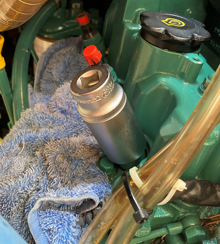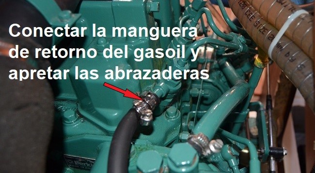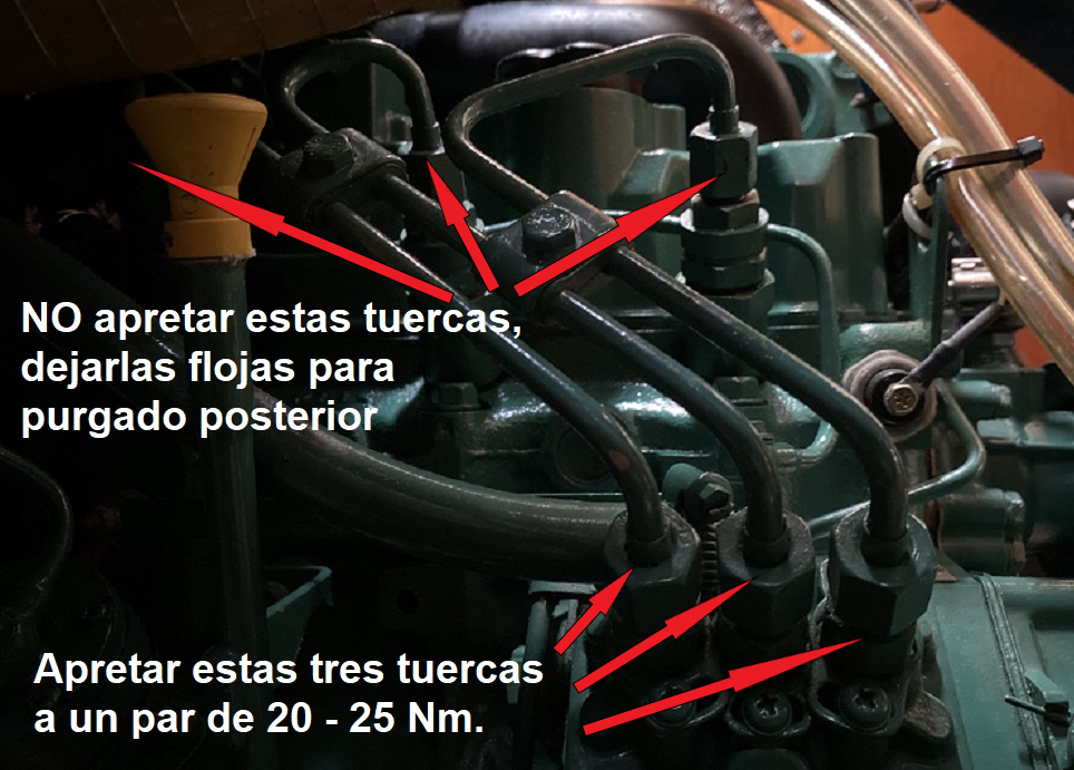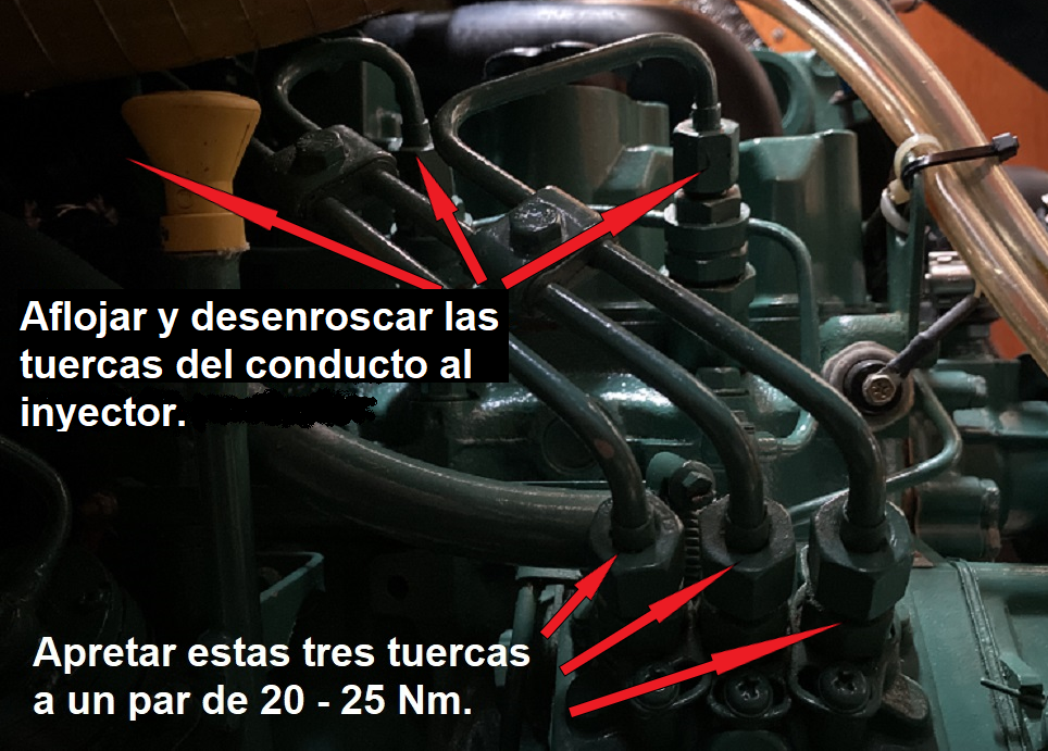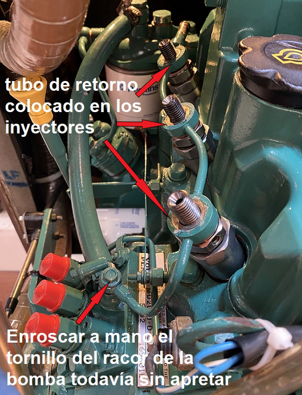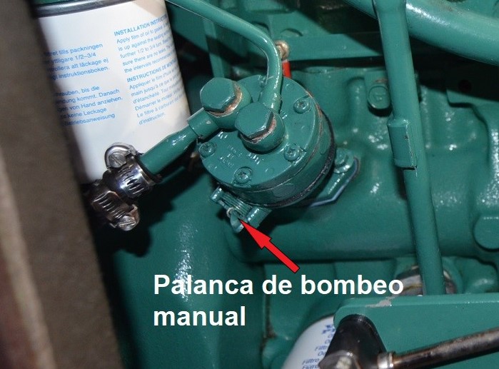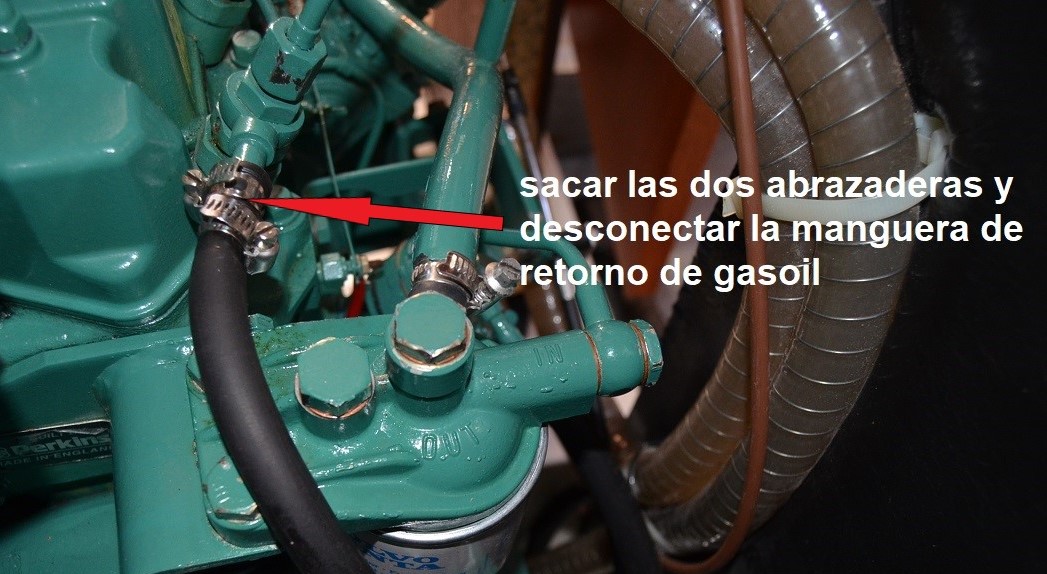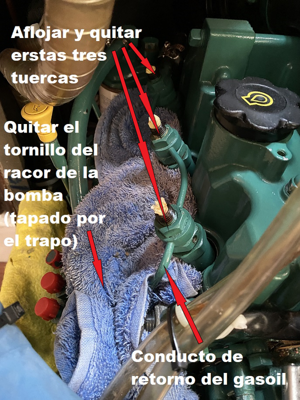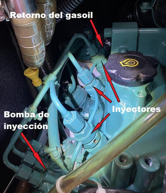 La existencia de aire en el circuito de gasoil puede provocar un funcionamiento irregular del motor o la parada completa del mismo. Es por ello que después de realizar cualquiera de las operaciones descritas hasta ahora, será necesario purgar el circuito de gasoil para eliminar cualquier traza de aire. PURGADO DEL PREFILTRO DE GASOIL: Si hemos vaciado el depósito para su limpieza o si hemos cambiado el pre-filtro de gasoil, lo primero que tenemos que purgar es precisamente el pre-filtro. Si como es lo más habitual, el pre-filtro está más bajo que el depósito de combustible, primero, con el tornillo de purga cerrado, bombearemos con la palanca de la bomba de baja un minuto para aspirar gasoil del depósito y asegurar que el conducto desde el depósito hasta la entrada del pre-filtro esté lleno de gasoil. (la palanca debe hacer una pequeña resistencia, si no, girar el motor a mano para mover la posición de la leva, hasta que se note resistencia). https://i.postimg.cc/FKmmVkjR/DSC-0044.jpg A continuación, ponemos un recipiente debajo para recoger el gasoil que pueda gotear, y un papel de cocina absorvente alrededor del tornillo de purga del pre-filtro y lo abrimos un par de vueltas para que vaya saliendo el aire a medida que va entrando gasoil del depósito que fluirá por gravedad al estar más bajo que el depósito. Como el filtro y la cazoleta están vacíos, puede tardar un rato. Cuando solo salga gasoil sin burbujas por el tornillo de purga lo cerramos y lo apretamos. Hay dos formas de facilitar y acelerar el proceso: 1- Instalar una pera de bombeo manual de gasoil en el conducto un poco antes del pre-filtro, o un porta-filtro con cebador, de modo que podamos bombear a mano más rápido y sin necesidad de actuar primero sobre la palanquita de la bomba de baja. https://i.postimg.cc/vHgQYsYQ/D-NQ-N...-112022-O.webp https://i.postimg.cc/t4Fp6Nnw/FILTRO...DOR-i3559.webp 2- O, soltar la manguera de aireación del depósito de gasoil (no el retorno de gasoil, ojo) y ponerle una prolongación que llegue hasta el motor. Si soplamos por ese extremo, metemos presión al depósito y el gasoil fluye rápidamente así bombeado hacia el pre-filtro y hacia la bomba de baja presión. Como es una operación que hago cada dos años, esta segunda opción es la que utilizo, para evitar más uniones en los conductos. https://i.postimg.cc/28ZDp7Gy/IMG-1374.png Si el pre-filtro está más alto que el depósito, habrá que utilizar cualquiera de estas dos últimas opciones para bombear el gasoil hacia el pre-filtro mientras abrimos el tornillo de purga para que salga el aire. PURGADO DEL FILTRO DE GASOIL DEL MOTOR: Si hemos cambiado este filtro tendremos que realizar este purgado. Si por alguna razón ha entrado aire en el circuito, purgamos primero el pre-filtro como comentado y después este filtro del motor. Para ello, ponemos un papel de cocina absorvente alrededor del tornillo de purga del filtro y abrimos el tornillo un par de vueltas. Colocar un trapo debajo para recoger el gasoil que goteará. https://i.postimg.cc/Y9CHJcDB/DSC-0069-2.jpg A continuación, bombear manualmente con la palanquita de la bomba de gasoil hasta que salga gasoil sin aire por el tornillo de purga. Cuando sale solo gasoil, sin aire, cerrar el tornillo sin dejar de bombear, y después apretarlo. Tener en cuenta qué si se cambió el filtro y está lleno de aire, será necesario bombear un rato antes de que el gasoil llegue al tornillo de purga. Si no se nota algo de resistencia al bombear rápido, entonces girar el motor a mano para mover la posición de la leva que acciona la bomba, hasta que se note cierta resistencia al accionar rápidamente la palanca. PURGADO DE INYECTORES Y CONDUCTOS DE SUMINISTRO DESDE LA BOMBA INYECTORA. Si hemos sacado los inyectores o los conductos que le suministran el gasoil desde la bomba de inyección, entonces será necesario purgar esta parte del sistema. Partimos de inyectores colocados en su sitio y apretados al par fijado por el fabricante. Los conductos de alta que van de la bomba de inyección a los inyectores deben de estar con las tuercas que los fijan a la bomba apretadas, y las que los fijan a los inyectores desenroscadas hasta que queden con solo una vuelta de rosca, de modo que el gasoil pueda salir por fuera. El hecho de dejarlos con una vuelta de rosca es para que salga por fuera el gasoil pero que también otra parte de gasoil caiga dentro del inyector y lo rellene para facilitar el arranque. https://i.postimg.cc/MZ4SrFyg/IMG-1122.png Poner un papel de cocina absorvente rodeando la rosca del inyector que queda debajo de la tuerca, haciendo buen contacto de modo que podamos distinguir más adelante cuando se humedece porque sale gasoil por el conducto. Poner la palanca de aceleración del morse a tope de gas (sin engranar la marcha). Dar el contacto y hacer girar el motor con el motor de arranque durante 10 segundos y dejar descansar la batería y el propio motor de arranque un par de minutos. Volver a dar contacto durante otros 10 segundos, descansar otros dos minutos y así sucesivamente. Después de cada vez que se da contacto, verificar si el papel absorvente se ha humedecido con gasoil que ya sale por el conducto. Debería de ocurrir tras dar contacto cuatro o cinco veces. Cuando esto ocurra en los tres conductos, apretar las tuercas que unen los conductos a los inyectores con llave dinamométrica ajustada a 25 Nm. Con la llave de contacto, conectar los calentadores durante 10-12 segundos y dar contacto de arranque con el morse a tope de gas. Si hemos hecho todo correctamente, el motor debe de arrancar en un par de segundos y girar redondo y sin titubeos. Lógicamente, en cuanto arranca quitamos gas porque el motor está frio. Una vez que terminamos todas las tareas de cambios de filtros y purgados, el motor se habrá manchado de gasoil, aunque hayamos tomado todas las precauciones. Para evitar olores a gasoil dentro del barco, se puede lavar el motor con una esponja co