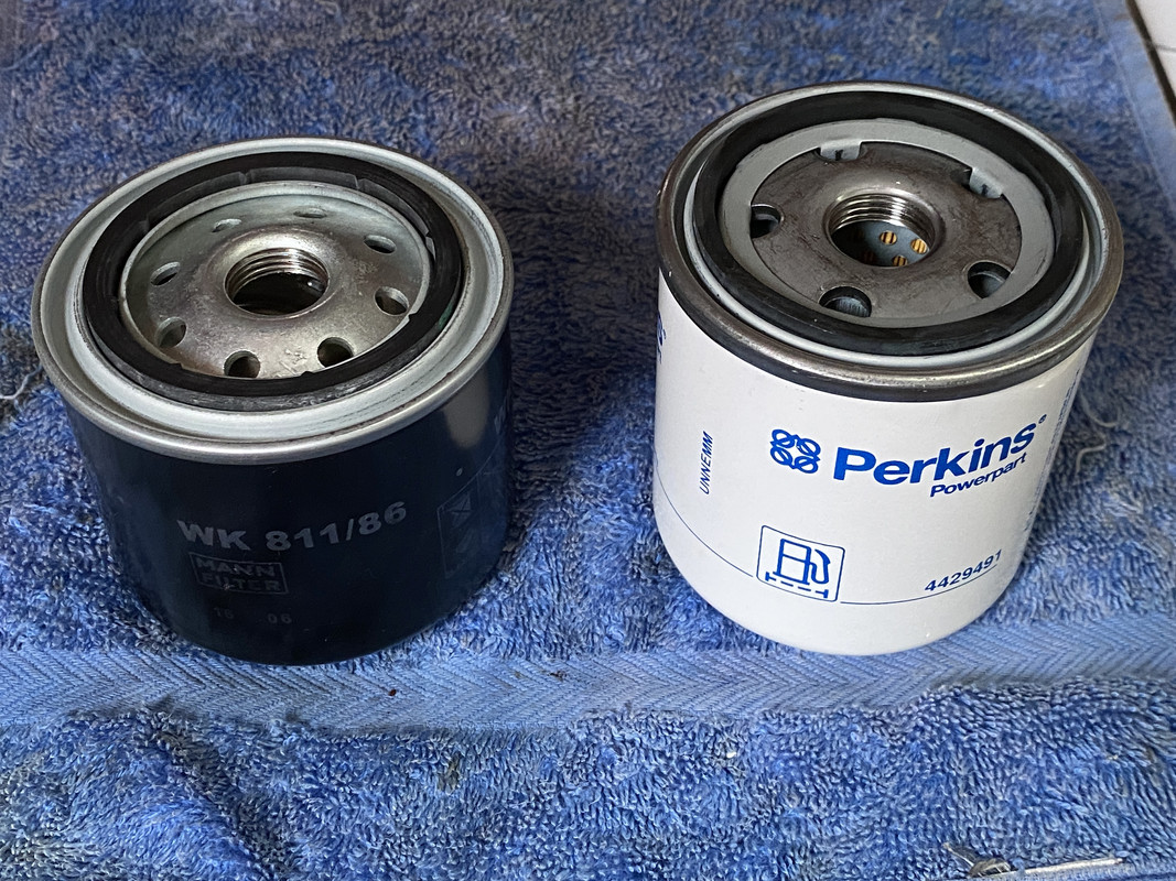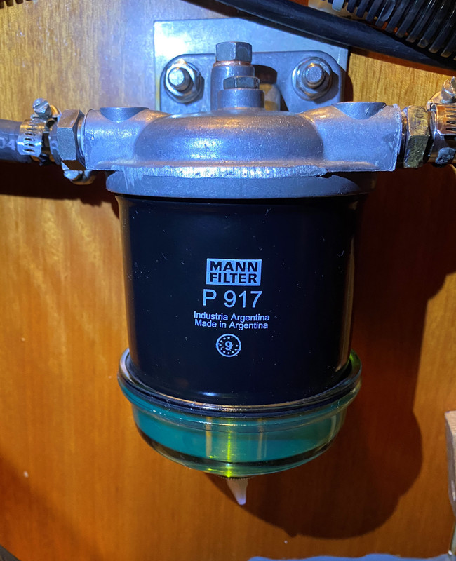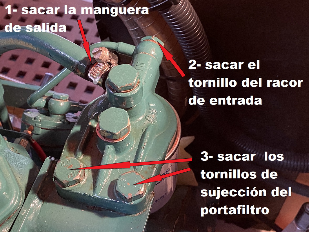 El filtro de gasoil de motor se cambió hace cinco años y unas 500 horas de motor. Además del filtrado de partículas sólidas del combustible, estos filtros finos de gasoil están diseñados para impedir en la medida de lo posible el paso del agua contenida en el gasoil hacia la bomba de inyección y los inyectores, que son muy sensibles al oxido que pueden generar las micro gotas de agua que les lleguen. https://i.postimg.cc/rwGymSS3/DSC-0069-2.jpg https://i.postimg.cc/qvHM4mC2/DSC-0048-2.jpg Al igual que en el caso del pre-filtro, lo que voy a indicar continuación es una opinión personal y no estoy animando a no seguir las instrucciones del fabricante. Simplemente expongo como lo hago yo y el razonamiento de por qué lo hago así. El fabricante indica el cambio del filtro de gasoil cada 200 horas o cada año. A mi particularmente me parece una frecuencia excesiva. Por un lado, como ya comentado, el filtro no se deteriora con el tiempo con lo cual no parece lógico indicar un cambio por tiempo de calendario. En cuanto al cambio por horas de motor, la razón de especificar un número de horas es que a medida que va filtrando el gasoil, el filtro va reteniendo las micro-impurezas del mismo y ello conlleva una mayor resistencia al paso del combustible pues el filtro se va tupiendo y se van tapando los micro-orificios por los que circula el gasoil. Como el filtro recibe el gasoil de una bomba de baja presión, en un caso extremo de que el filtro estuviese excesivamente tupido, podría reducir el caudal de gasoil hasta hacerlo insuficiente para la demanda del motor. El fabricante vende motores que van a trabajar en todas las partes del mundo, en algunos sitios con gasoil de muy baja calidad y su recomendación tiene que ser para el peor de los casos en los que va a trabajar el motor. A lo largo de las 200 horas que indica el fabricante, el motor habrá consumido alrededor de 400 litros de combustible, lo cual no es mucho para este filtro si usamos gasoil de buena calidad. Además el gasoil viene pre-filtrado por otro filtro mas basto que retuvo las partículas mayores de 10 micrones. Este retiene hasta 2 micrones. Yo hago unas 100 horas de motor al año y cambio este filtro cada 5 años, Es decir, cada 1.000 litros filtrados, sin haber tenido nunca el más mínimo problema debido a ello en mas de 30 años. En automoción se suele cambiar cada 50.000 km, es decir, aproximadamente cada 3.000 litros filtrados Por lo comentado, utilizando gasoil de confianza, a mí me parece razonable cambiar el filtro de gasoil del motor cada 5 años o cada 500 horas, lo que ocurra antes, siempre que haya un pre-filtro en el circuito. Para cambiar el filtro, lo primero es cerrar la llave de la salida de gasoil del depósito. Tener preparado un recipiente para vaciar el gasoil del filtro usado. A continuación, para evitar que caiga gasoil por los recovecos del motor, que es mas difícil de limpiar, colocar un paño debajo del filtro que abarque la zona de posibles goteos. Colocar una bolsa plástica (sin agujeros) alrededor del filtro de modo que sus bordes queden mas altos que la parte superior del filtro, para recoger el gasoil que inevitablemente va a salir al aflojar el filtro. Una buena opción son las bolsas plásticas con labios de cierre estanco. https://i.postimg.cc/bYGtvBd5/IMG-1321.jpg Con una llave de filtros, aflojar el filtro lo suficiente para poder continuar desenroscando a mano. Una vez sacado el filtro, y vaciado su contenido al recipiente que tenemos preparado, se cierra la bolsa con el filtro usado dentro. Humedecer la junta de goma del nuevo filtro con un poco de gasoil y enroscarlo a mano hasta que la junta haga contacto con el porta-filtro y a partir de ahí enroscarlo media vuelta más. https://i.postimg.cc/LsNHk2QV/IMG-1253.png Abrir la llave de salida de gasoil del depósito, purgar el filtro y comprobar que no hay fugas. Puede ocurrir que, dependiendo del tamaño del filtro, queda muy ajustado contra el bloque del motor y tropieza con éste al desenroscarlo. Pasa con los filtros originales, tanto de Volvo como de Perkins. En este caso será necesario desmontar el porta-filtro para realizar el cambio. Hay otros filtros equivalentes cuyo formato es un poco mas de diámetro y menos altura con lo cual el problema se soluciona. Ver imagen comparativa: https://i.postimg.cc/JtVm7ntR/IMG-1330.jpg Como tenía montado un filtro original de Volvo y voy a montar uno equivalente de Perkins (que es el fabricante de este motor y es más barato), en mi caso tengo que desmontar el porta-filtro. Para ello, ponemos debajo trapos para recoger los goteos de gasoil sobre el motor. Primero aflojamos la abrazadera y desconectamos del porta-filtro la manguera que va hacia la bomba de inyección, dejando su extremo elevado para que no gotee. A continuación aflojamos y sacamos el tornillo del racor de entrada de gasoil al porta-filtro (el conducto que viene de la bomba de gasoil de baja presión) teniendo cuidado de recoger las dos arandelas de estanqueidad de cobre que hay a cada lado del racor. https://i.postimg.cc/76RwcXkG/IMG-1334.png Sacar los dos tornillos de sujeción del porta-filtro, y ya podemos retirar todo el conjunto. Vaciar el gasoil por el hueco del racor de entrada inclinando el conjunto hacia ese lado. Una vez vaciado, desenroscar el filtro del porta-filtro con la ayuda de una llave de filtros. Limpiar bien el interior del porta-filtro con un paño que no suelte pelusa. https://i.postimg.cc/43JfhmPd/IMG-1327.png Humedecer la junta de goma del nuevo filtro con un poco de gasoil y enroscarlo a mano hasta que la junta haga contacto con el porta-filtro y a partir de ahí enroscarlo media vuelta más. https://i.postimg.cc/RFhvXyjx/IMG-1333.jpg Montar el conjunto en su posición y colocar primero el racor de entrada de gasoil con arandelas nuevas de cobre a cada lado y roscando el tornillo del racor sin apretar, solo presentado. A continuación fijar el porta-filtro al bloque con los dos tornil