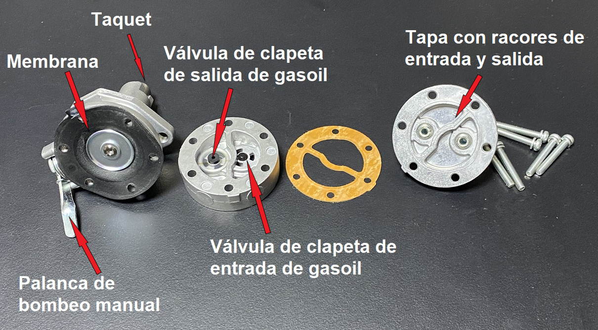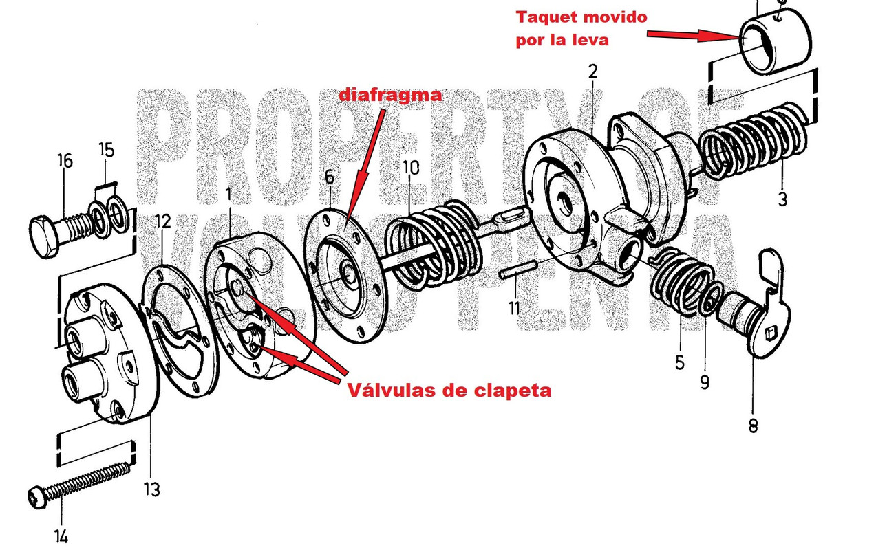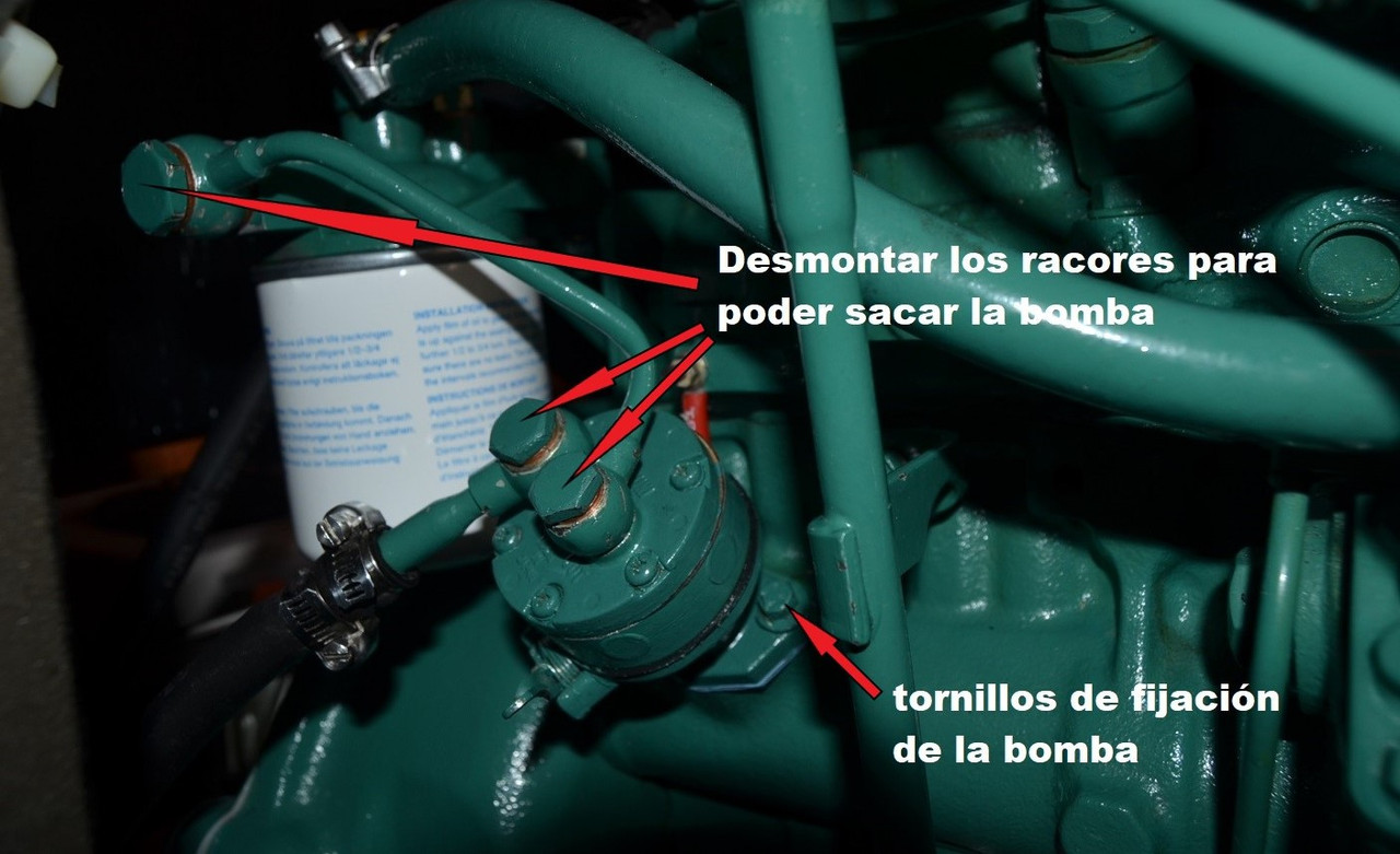 En una revisión rutinaria de mantenimiento no es necesario desmontar esta bomba, no obstante, veremos cómo se desmonta y que posibles problemas puede dar por si llegase el caso de una avería. https://i.postimg.cc/HxJ1syby/DSC-0044-2.jpg Esta bomba es accionada por una leva específica del árbol de levas que mueve el taquet de la parte inferior de la bomba. Éste transmite un movimiento alternativo a un diafragma. Dos válvulas de clapeta transforman en movimiento del diafragma en bombeo de gasoil a baja presión hacia el filtro del motor. Este es el despiece de la bomba: https://i.postimg.cc/mgrXsGYc/48423-2.jpg La avería más probable es la rotura del diafragma. En casos más raros, puede romperse uno de los muelles o fallar la válvula de clapeta. En caso de avería, se puede remplazar la bomba original completa por 43€ + impuestos y aduana: https://www.parts4engines.com/volvo-...lift-pump-kit/ Si se van a hacer largas travesías, una bomba es un repuesto a tener en cuenta. Para desmontarla hay que retirar primero los dos racores e entrada y salida de gasoil, éste último hay que soltarlo también del porta-filtro. Antes de aflojarlos, es recomendable rodearlos con un paño que recoja el goteo del gasoil para que no escurra por el motor. A continuación, se aflojan los dos tornillos que la fijan al bloque motor y ya podemos retirarla. https://i.postimg.cc/vZPKgmYL/DSC-0046.jpg Una vez que la hemos sacado, podemos abrirla quitando los 6 tornillos de la parte superior que unen la diferentes partes de la misma. https://i.postimg.cc/7hsz1jfc/IMG-1340.png Si se observan todas las piezas en buen estado, limpiar los puntos donde hacen el cierre las válvulas y cerrar la bomba colocando una junta nueva (n12 de la figura de arriba). Apretar los tornillos presentándolos primero, y apretando después poco a poco de modo alternativo en el siguiente orden: 1, 4, 2, 5, 3, 6, 1, 4, 2 etc. Montar la bomba en el bloque colocando una junta nueva. Según la posición del árbol de levas puede ser que el taquet de la bomba apoye en la leva y nos obligue a vencer al resorte para asentar la bomba en el bloque. Una solución para facilitar la tarea es girar el cigüeñal hasta que la leva coincida en la parte baja y haga menos resistencia. Volver a colocar los racores poniendo las arandelas de estanquidad de cobre nuevas. Una vez todo colocado hay que realizar el purgado del motor como se verá en un capítulo posterior y comprobar que no hay fugas. . |