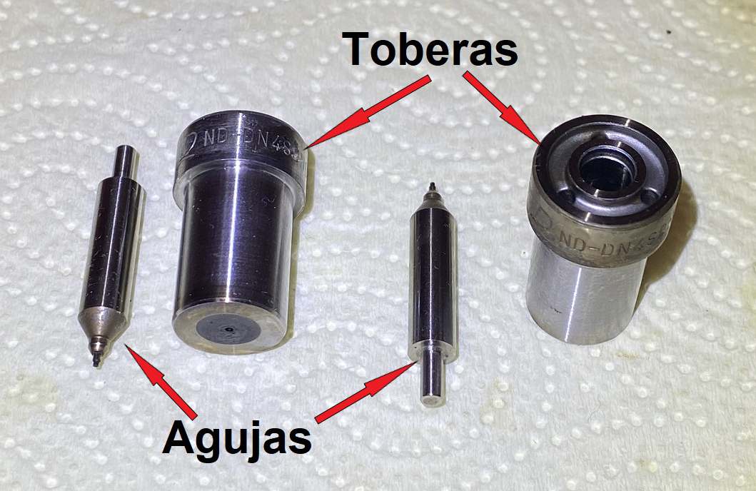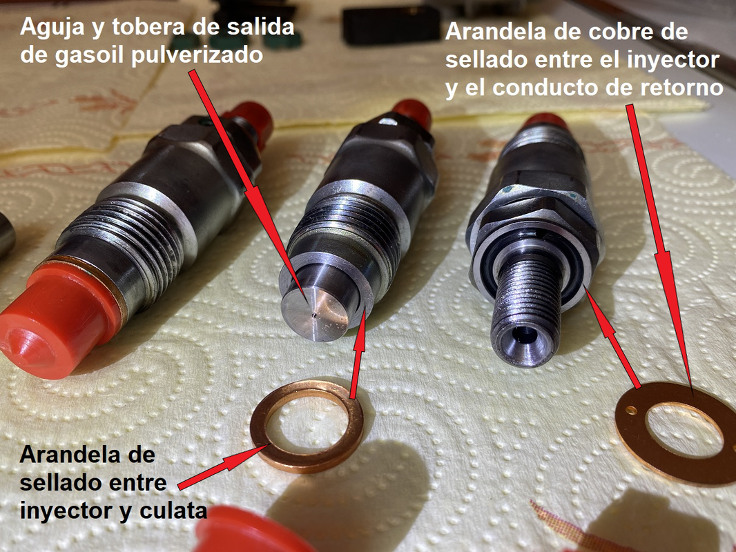 Los inyectores del MD2030 son del tipo “mecánico de espiga” y están fabricados por Nipon- Denso. En un mantenimiento rutinario no es necesario desmontar o limpiar los inyectores. En este motor, del año 2005 y con 1.850 horas de funcionamiento, nunca fueron desmontados. Arranca al primer segundo de dar el contacto y no salen humos en el escape. El fabricante recomienda hacer una prueba de presión cada dos años o 400 horas. Una vez más, en mi opinión y usando gasoil de buena calidad, los inyectores pueden hacer perfectamente su trabajo muchas más horas sin necesidad de ser desmontados o comprobados. Un buen indicador de su estado es la cantidad y aspecto de los humos de escape. Humos negros indican combustible sin quemar, bien porque están sucios y gotean gasoil, bien porque ha bajado la presión a la que inyectan el combustible y la pulverización no es adecuada, o bien porque acusan desgaste en las toberas. Por si esto fuese el caso, vamos a comentar cómo funcionan y como se sacan los inyectores. El esquema de funcionamiento del inyector mecánico de espiga es el siguiente: https://i.postimg.cc/d3N73v0Q/29-1.jpg El gasoil procedente de la bomba de inyección (gasoil de color rosa en la imagen) entra a alta presión por la parte superior del inyector. Cuando la presión alcanza los 120 kg/cm2, el gasoil hace suficiente fuerza en el cono inferior de la aguja del inyector como para vencer al muelle que la empuja hacia abajo. Entonces la aguja se desplaza hacia arriba y abre el paso de gasoil hacia la salida de la tobera, por donde sale finamente pulverizado a alta presión. Como vimos en el apartado de la bomba de inyección, al final de la inyección la presión cesaba de golpe con lo cual, en ese momento, la aguja baja impulsada por el resorte y cesa instantáneamente la salida de gasoil pulverizado. El gasoil excedente sale por el tubo de rebose y vuelve al depósito de combustible por el conducto de retorno. Vamos a ver ahora cómo desmontar los inyectores. En estas operaciones en las que está implicada la bomba de inyección o los inyectores, la limpieza de la zona es muy importante para evitar la penetración de partículas o suciedad en los inyectores o en el hueco de los mismos por los que caerían hacia los cilindros. Limpiar cuidadosamente con un pincel todo el entorno del alojamiento de los inyectores hasta que no quede nada de suciedad. Hay que tener en cuenta que vamos a trabajar con piezas de alta precisión que tienen tolerancias de 2 milésimas de milímetro, y cualquier impureza, por pequeña que sea, puede causar un problema. Los 3 inyectores están conectados a la bomba de inyección por tres conductos con sus respectivos terminales a ambos lados: https://i.postimg.cc/9F40b6MT/IMG-0840.jpg https://i.postimg.cc/L81q9cFR/DSC-0045.jpg La primera operación consiste en aflojar las tuercas de los terminales de los 3 conductos de alimentación que van desde la bomba inyectora hasta los inyectores, retirando con cuidado los tres conductos que se mantendrán unidos por las pletinas de conexión. Para evitar la entrada de impurezas a los conductos, es conveniente meterlos en una bolsa estanca nueva. En la entrada del inyector se coloca un tapón especial para inyectores para evitar entrada de impurezas. https://i.postimg.cc/gjgM0wRw/IMG-1254.jpg https://i.postimg.cc/fLj26qRf/IMG-1255.jpg A continuación, se aflojan las abrazaderas y se desconecta la manguera de goma del conducto de retorno del gasoil. https://i.postimg.cc/W4cdh5sZ/DSC-0069.jpg A continuación, se sacan las tuercas de la parte superior de cada inyector y el tornillo del racor que une el conducto de retorno del gasoil a la bomba de inyección y se retira dicho conducto. Volver a poner el tornillo del racor en la bomba de inyección, solo presentado, sin apretar. El conducto de retorno también es conveniente meterlo en una bolsa estanca nueva para preservarlo de las impurezas. https://i.postimg.cc/90ym5hqN/IMG-1258.png https://i.postimg.cc/jq6YbvF9/IMG-1265.jpg Ahora ya están libres los inyectores y podemos proceder a sacarlos. Van roscados a la culata y vamos a necesitar una llave de vaso larga para aflojarlos. La arandela de cobre con las dos perforaciones que está entre el inyector y el conducto de retorno se pondrá nueva cuando se reinstalen: https://i.postimg.cc/YC95Q7CK/IMG-1276.jpg CONTINUA EN OTRO POST |