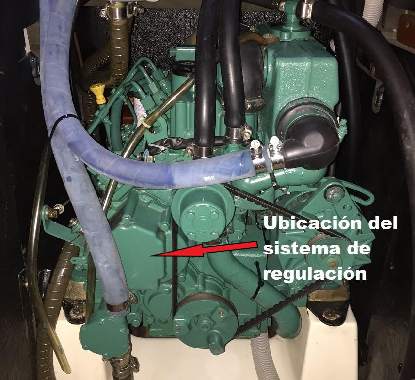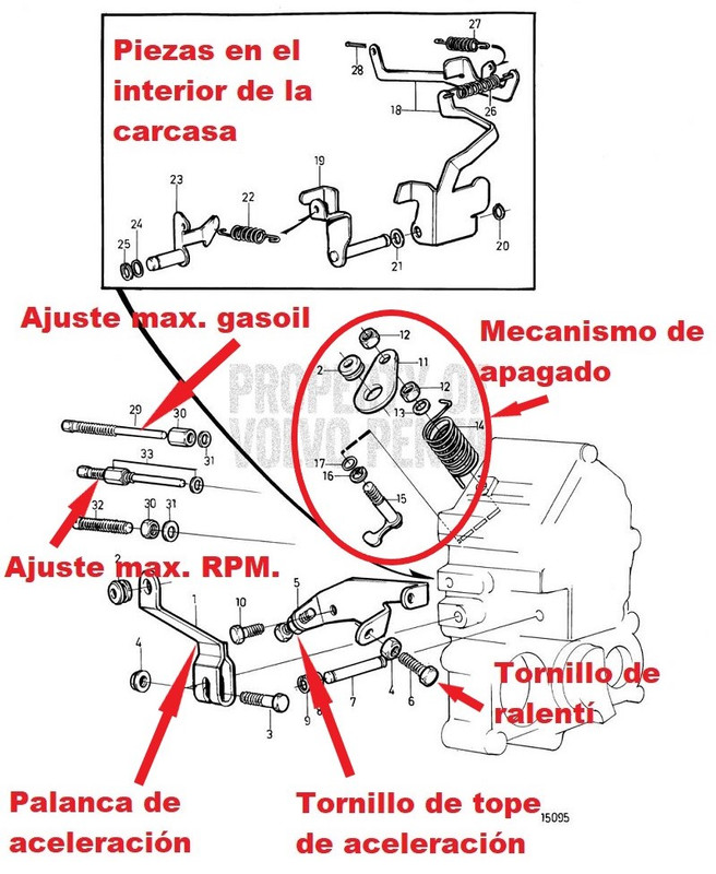 Este mecanismo no necesita mantenimiento rutinario, pero dado que pueden fallar alguna de sus partes y provocar el mal funcionamiento del motor, vamos a explicar cómo funciona para que, llegado el caso de ese mal funcionamiento, sea más fácil de identificar si éste es el causante. Cuando movemos la palanca del acelerador a las revoluciones deseadas, el regulador de velocidad es el elemento que mantiene esas revoluciones del motor constantes. Además, este mecanismo limita las revoluciones máximas que puede alcanzar el motor, con carga o en vacío, para evitar daños en el mismo. También compensa las variaciones de carga del motor actuando sobre la corredera de la bomba de inyección variando la cantidad de gasoil, para mantener las revoluciones lo más constantes posible. Si este mecanismo sufre una avería, el motor presenta una marcha irregular variando las r.p.m. sin que toquemos el acelerador, puede no subir de revoluciones o apagarse solo. Las averías, si se producen, suelen venir de algún resorte del mecanismo que se suelta o se rompe. Cuando falla este sistema, lo cual es poco frecuente, se tiende a achacar la marcha irregular del motor a filtros sucios, problemas de inyectores, moco del gasoil, codo de escape tapado etc, etc y generalmente nadie se acuerda del sistema de regulación con lo cual no se consigue solucionar el problema. En el MD2030 este mecanismo se encuentra detrás de la tapa indicada en esta imagen: https://i.postimg.cc/FF8sQ06j/IMG-9215.jpg Funciona actuando sobre la corredera de la bomba de inyección, pero sin interferir con el acelerador. Esquemáticamente el mecanismo es como se indica en esta figura: https://i.postimg.cc/yxMVXzRf/regula...de-verdad.webp El funcionamiento es el siguiente: cuando el motor está girando a unas revoluciones determinadas, sin tocar el acelerador, si las revoluciones tienden a aumentar, la fuerza centrífuga sobre los pesos aumenta y estos vencen el muelle separándose. Las palancas acodadas tiran del collar hacia la derecha de la figura y este a su vez tira de la deslizadera. Como la barra de transmisión vertical gira sobre el punto marcado con la flecha “dado deslizante”, si la deslizadera de la parte inferior se desplaza a la derecha, entonces la parte superior de la barra se desplazará hacia la izquierda y, a través de la varilla de regulación, moverá la cremallera hacia la izquierda, girando el embolo de la bomba y reduciendo la cantidad de gasoil suministrado. Si por el contrario las revoluciones tienden a bajar, los contrapesos se acercarán y todo el mecanismo se moverá al revés qué en el caso anterior, moviendo la cremallera hacia la derecha, girando el embolo y aumentando el suministro de gasoil. En el caso del MD2030 el despiece del mecanismo es el de la siguiente figura: https://i.postimg.cc/q7wvfSfR/15095.jpg En las piezas que van en la parte interior de la carcasa se puede observar arriba la varilla de regulación y el pasador “28” que la une a la cremallera de la bomba de inyección. Como comentado, si hay un problema con este mecanismo generalmente será debido a la rotura o desprendimiento de alguno de los muelles “22”, “26” o “27” de la figura anterior. En las fotos de abajo (extraídas del manual de Volvo) se pueden ver las piezas tal como van montadas: https://i.postimg.cc/ydWBMNXQ/IMG-1345.png https://i.postimg.cc/QdkX5wdb/IMG-1233.png https://i.postimg.cc/G2Nrd1Xc/IMG-1342.png Las piezas que son visibles desde el exterior del motor: https://i.postimg.cc/zBPDvhGY/DSC-0050.jpg Los tornillos de ajuste de máximo suministro de gasoil y de máximas revoluciones del motor vienen ajustados de fábrica y no se deben de tocar, por ello están protegidos por un encapsulado. Con el tornillo de ajuste de ralentí se ajusta éste, que debe de estar entre 800 y 850 rpm. Cuando se proceda al ajuste, aflojar si es necesario la tuerca del final del cable para que no limite el desplazamiento de la palanca. Lo que debe limitar la posición de la palanca es el tornillo. Una vez ajustado el ralentí, la holgura (“6” de la figura) debe de ser de 3 mm, ajustando para ello la tuerca “8”. https://i.postimg.cc/y8qd00XV/Ajuste-ralent.png No hay más ajuste a realiza en ese mecanismo. . |