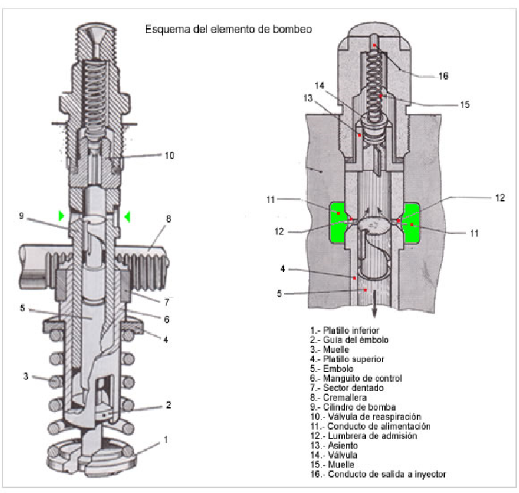 En un mantenimiento rutinario como el que trata este tutorial, no será necesario tocar la bomba de inyección, no obstante, como es una parte muy importante del circuito de combustión del motor, me parece interesante realizar algunos comentarios sobre su funcionamiento. La bomba de inyección está fabricada por Nipon-Denso para el MD2010, 2020 y 2030 y por Bosh para el MD2040 La bomba de inyección mecánica es una pieza de alta precisión y no es recomendable que sea manipulada sin los conocimientos adecuados. Solamente se desmontará cuando haya algún problema de funcionamiento achacable a la misma. https://i.postimg.cc/mkzLHrPz/DSC-0044-2.jpg La bomba de inyección del MD2030 es tipo Bosch y formato PE, es decir, que no tiene árbol de levas propio, si no que utiliza el mismo árbol de levas empleado para accionar las válvulas de admisión y escape y la bomba de baja. Debido a ello no es posible variar el avance de inyección mediante el giro del árbol de levas como en las bombas que tienen su propio árbol de levas. El avance de inyección significa que la inyección de gasoil a los cilindros se produce antes de que el pistón llegue al punto muerto superior. Se mide en grados de giro del cigüeñal. En este motor el avance de inyección es fijo y es, según el año de fabricación, de 21.5 o de 22.5 grados del cigüeñal antes del punto muerto superior. La siguiente imagen es del árbol de levas del MD2030 que es único para todas las funciones: https://i.postimg.cc/Z5rqH0V6/arbol-de-levas.png Las levas marcadas “A” accionan las válvulas de admisión y escape. Las marcadas “B” accionan los émbolos de la bomba de inyección de cada cilindro. La “C” acciona la bomba de gasoil de baja. La misión de la bomba de inyección es suministrar una cantidad precisa de gasoil (según la posición del acelerador), en el instante preciso, y a la presión requerida para conseguir la apertura del inyector. Para conseguirlo, se emplea un sistema de pistones accionados por levas y que se mueven dentro de unos cilindros que poseen unos orificios de alimentación de combustible. El pistón tiene una ranura lateral que se comunica con un rebaje en diagonal llamado rampa sesgada. En la siguiente figura se explica el funcionamiento: - En “1” el émbolo está en su PMI y los orificios de alimentación laterales están abiertos permitiendo el acceso del gasoil al cilindro de la bomba. - En “3” en émbolo está en la posición de inicio de bombeo. - En “4” la presión del combustible al ascender el émbolo hace abrirse la válvula de presión de la parte superior y el gasoil fluye a alta presión hacia el inyector. - En “5” la rampa sesgada del pistón (que está conectada con la cabeza por la ranura lateral) descubre el orificio de salida con lo cual cesa la presión, finaliza la inyección y se cierra la válvula superior que se había abierto por la elevada presión. La válvula incluye una zona maciza cuyo volumen al bajar se resta al de la tubería que conduce al inyector, y provoca un vacío en el combustible y por tanto el cese inmediato de la inyección. - En “2” el embolo se encuentra en la posición de suministro nulo con la acanaladura vertical situada frente a uno de los orificios de alimentación, de modo que, aunque ascienda no bombeará nada de gasoil. Esta posición es la que se emplea para apagar el motor. https://i.postimg.cc/Bv4nVsVk/bomba-...ccion-02-2.jpg Para variar la cantidad de combustible bombeado, existe un mecanismo de cremallera o corredera (nº8 en la figura de abajo) que gira los émbolos de modo que la rampa sesgada lateral de los mismos descubra antes o después el orificio lateral del cilindro. Puede verse el sistema en la siguiente ilustración: la cremallera hace girar una camisa exterior que está unida en su parte inferior al vástago del embolo. https://i.postimg.cc/vBmHGhMv/1.png En la siguiente imagen de la bomba se ha marcado la corredera y el muñón donde se acopla la barra de mando de la corredera, que viene accionada por el acelerador y por el sistema de regulación mecánico del motor que veremos también en este capítulo. https://i.postimg.cc/nhtFXppr/m30-in...mp-58412-2.jpg Y el despiece de la bomba donde se ven los distintos componentes: https://i.postimg.cc/fTdWWJ41/48422-2.jpg Si se desmonta la bomba de inyección para llevarla a revisar a un taller especializado, cuando se vuelva a montar será necesario ajustar el punto exacto del inicio de la inyección. Esta parte no se tratará debido a su mayor dificultad y a que no es una tarea de mantenimiento rutinario, que es el objeto de este tutorial. Si por alguna razón se desmonta la bomba de inyección y sin modificarle nada se vuelve a montar, es importante volver a colocar los mismos suplementos calibrados que había entre la bomba y el bloque porque así no variará el punto de inyección. Estos suplementos calibrados se emplean precisamente para ajustar el avance de la inyección. CONTINUARA EN OTRO POST . |