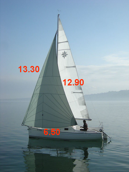 Desde el puño de driza, al final de los 13,30 está el puño de amura... y siguiendo este al final de los 6,50 está el puño de escota y si sigues este llegas despues de contar 12,90 otra vez al puño de driza.