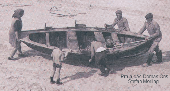 Según parece lo que están varando en la playa es una Dorna. Fondo plano, sin pantoque, y liviana de peso. Un barco para la ria y poco mas.