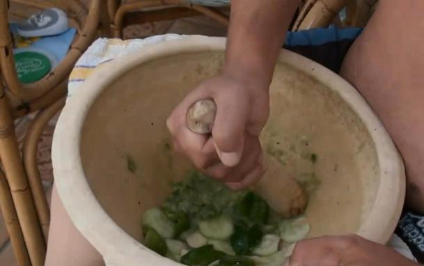 Ingredientes: - 1 kilo de tomates - 1/2 pepino (100 gramos) - 1 pimiento - 4 dientes de ajo - 100 cc de aceite de oliva - sal - agua (poco más de medio litro) - pan de masa dura del día anterior - huevo duro, melón.... Esto se hace majado en un dornillo de tamaño adecuado (también se puede usar la batidora y dejarlo grumoso; a gusto del consumidor). En el dornillo picamos los ajos, el pepino (dejándole un 50% de la piel al pelarlo), el pimiento y la sal. Majamos hasta deshacerlos. Luego añadimos los tomates, también muy picaditos y continuamos majando, hasta dejarlo lo más líquido posible. Añadimos el aceite y removemos. Añadimos el gua (muy fría). Tostamos el pan y lo troceamos. Lo añadimos a la sopa fría, hasta que embeba todo el caldo. Escurrimos con mucho cuidado, colocando un tenedor o una espumadera rectangular en el filo del dornillo. Luego lo servimos en un plato y le añadimos el huevo duro picado, el melón... o cualquier otro ingrediente que se le pueda antojar al comensal. Cuando hace más de 40º a la sombra, es una comida exquisita. Y con 30º también. :cunao: Buen provecho. :brindis: |
