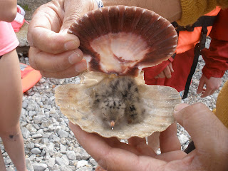 En la zona de vegetación suelen anidar los charranes (únicas colonias en el Cantábrico: 33 parejas contabilizadas). Los charranes son más pequeños que las gaviotas patiamarillas, tienen forma de golondrina y son más agresivos, tal vez por estar en inferioridad de condiciones con sus depredadoras las patiamarillas, que en cuanto se descuidan se comen sus huevos y hasta sus crías. Ponen los huevos de tres en tres como las patiamarillas, y del mismo color pardo moteado, pero son pequeñitos como los de las palomas. Tuvimos la suerte de encontrar un nido con dos polluelos y un huevo aún sin eclosionar. En 17 años que llevamos de Carpe Diem es el primero que encontramos estos polluelos. Una de las conchas de peregrino que encontramos parecía hecha a la medida para ser su casita.
