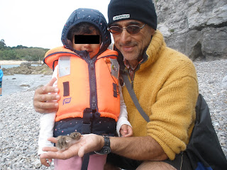 La isla tiene una playuca de arena de unos veinte metros de largo, pero tras algunos temporales del invierno, como ha ocurrido este año, la arena puede desaparecer y queda un playazo de piedras. La parte buena es que entre las piedras hay muchas conchas, caracolas y orejas de mar, sobre todo ahora al principio del verano que todavía no ha ido mucha gente. Dedicamos una parte de la tarde a recoger conchas.