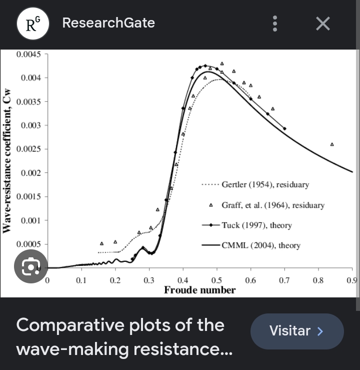 ![]() el trozo gordo en la cuesta arriba a la hora de superar la olita de la proa es llegar a 0.50 Froude para Surfear basta y sobra llegar ahí (que son 7,5 nudos de Velocidad con 6 metros de linea de Flotación) basta y sobra porque la grande Ola del mar le levanta el trasero al botecito ... Y ... Si el bote no hunde la Proa ... y si la Proa es una proa Sustentadora ... entonces sale volando por encima --- Creo que con un buen control de pesos se puede conseguir Casco en tablero de 10: 500 kg e incluso se podría pelear 450, pero mejor no nos hagamos ilusiones, Supongamos 500 Orza: 300 kilos Toda la montaña de cosas (y al carajo los inox, una batería de litio y, en fin, aquí en este capítulo como alguien dijo "un velero es un casco con un montón de chismes encima" es donde merece la pena perseguir pesos): 200 kilos Total, 1 Tonelada, Tabla de Surf de 1 Tonelada En crucero pesado por ejemplo joven aventurero oceánico: 1,25 Tons que multiplicado x 28300 (pues esto viene de la perdida Albion y vamos a comparar con metros) y dividido entre 5,99 x 5,99 x 5,99 = tatatachan Carena 164 D/L Y en modo Yayonauta jubilado honrado transportista de cervezas costeras pues tal vez Carena 144 D/L --- Recuerdo una navegada donde coincidimos con lo que visto desde nuestro barco era en terminología técnica y científica un puxx Sun Way 21 ... Pues bien, izamos tremendo Asimétrico ... y no había manera ... Y lo peor de todo ejque llegamos a puerto y allí estaban sentados tomando una cervezas y lanzándonos una sonrisa Un pequeñajo si logra orientar bien la vela de proa puede navegar con tal vez 15-17 metros cuadrados Efectivos por Tonelada ... Y algunos muchos cruceros abres el rumbo y a lo peor te quedas con 5-7 metros cuadrados por Tonelada que se puede arreglar atangonando la vela de proa o izando más trapo Y con un simple Foque volante y orientando bien el Foque/Trinqueta un pequeñajo puede ponerse en 30 metros cuadrados por Tonelada . Editado por U25pies en 09-02-2024 a las 20:13. |