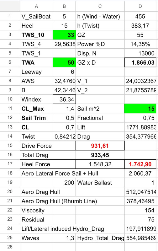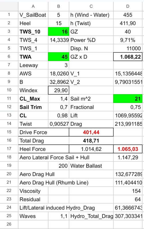 ![]() Cuesta Arriba en modo Yayonauta crucero costero ligero Potencia (expresada en porcentaje del Desplazamiento, D4) cerca del 10% Potencia (metiendo el 'turbo': una tripulación de 200 litros de agua de mar en los tanques de Lastre haciendo banda) 14% ![]() |