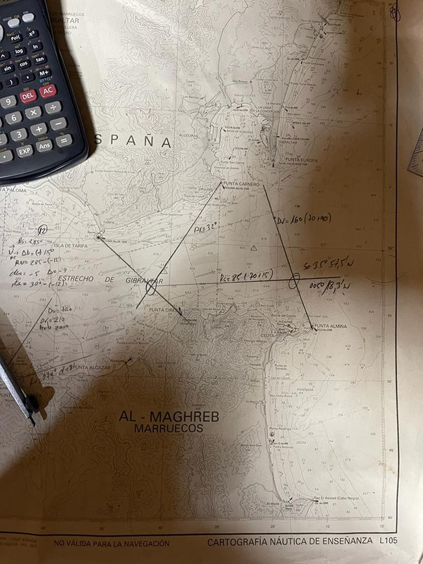 Estoy preparando el examen al próximo examen de patrón de yate en Andalucía, y haciendo los exámenes de años anteriores, he llegado a la 2ª Convocatoria del año 2017 (ejercicio 11 de la Unidad Teórica 4 - Navegación Carta, y que dice así A HRB 15:00 nos encontramos en la oposición de los faros de Isla de Tarifa y Punta Cires y simultáneamente Demora verdadera al Faro de Punta Carnero = 32º, navegando al Rumbo verdadero = 70º y velocidad de buque 8 nudos, con Viento del Norte que nos produce una batimiento de 15º, Calcular la situación al estar al través del faro de Punta Almina a) 36º 02,8' N 005º 20,8' W b) 36º 00,2´N 005º 19,6' W c) 35º 57,6' N 005º 17,2' W d) 35º 57,5' N 005º 18,3' W Me ubico, con la oposición y la demora y me da situación inicial 35ª 56,6N y L 5º 31,4 Tiro rumbo Rumbo de Superficie, ya que hay viento RS= Rv (70) + Abatimiento (+15), positivo porque el rumbo es Este y el viento viene del Norte, es decir, abate a Estribor. y me da un Rumbo de superficie de 85º, que trazo en carta. Trazo en la línea del rumbo que he pintado, a la altura de Almina, los 90º del través con respecto a Almina y me da un punto que yo señalo con la situación I 35º 57,7 N' L 5º 17,00 W, a la cual la opción más parecida es la "C", pero al corregirlo según el Organismo Oficial es la "D". Fallo en algo y será una tontería. creo ¿Alguien me puede ayudar? |