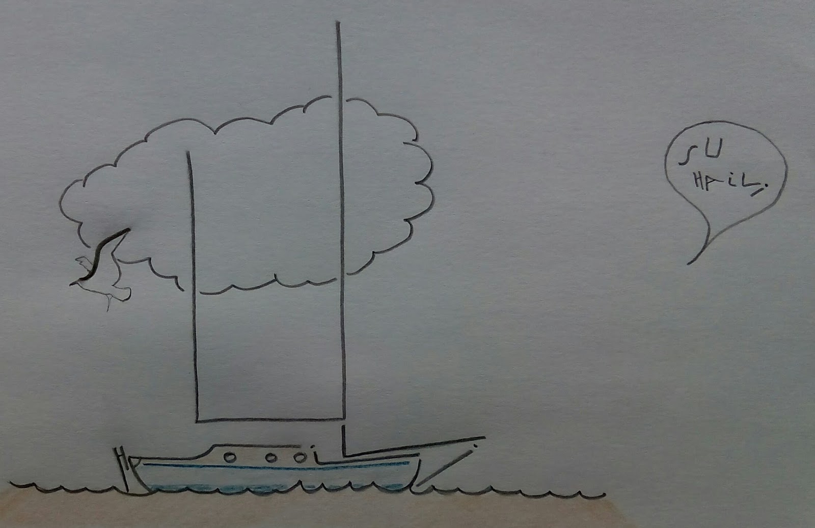 (aunque en otros textos le llaman SWAHILI, en el barco original iba escrito como en el dibujo): ![]() Todos los hierros que lleva a popa son restos del timón de viento. Como el Suhaili tenía mesana, no podía llevar la veleta en la popa porque la botavara de la mesana la arrancaba y le fabricó un andamiaje para llevar una veleta en cada banda: Pero en cuanto llegó a los mares del Sur el andamio de sotavento iba sumergido, frenaba el barco y dañaba igualmente la veleta. O sea que lo serró todo, lo tiró al mar, y continuó la vuelta al mundo regulando el rumbo sólo con el equilibrio de las velas. Un crak.