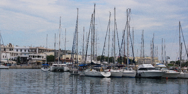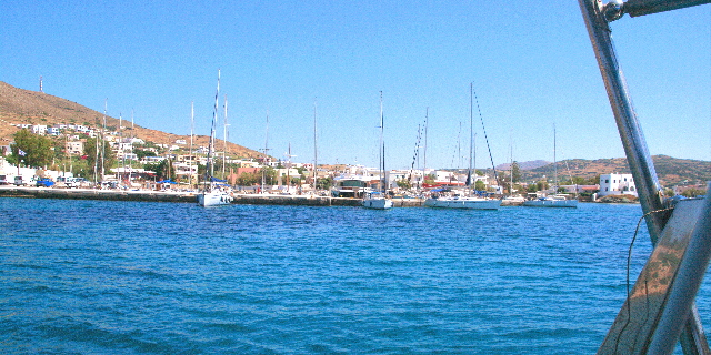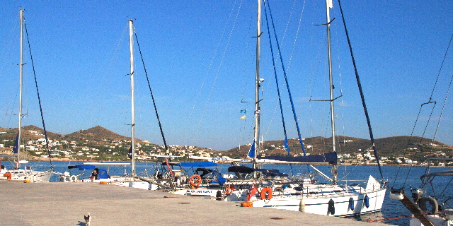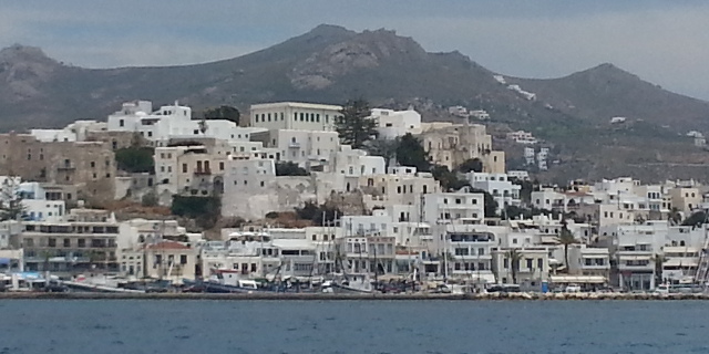 Solo 25 millas nos separan de Naxos, una de las islas de las Cicladas que no conocemos aún. Los vientos portantes del NNW. nos empujan sin mayores problemas y tras de 5 horas, sobre la 1 de la tarde llegamos al puerto de Naxox y dentro de él a la "marina" Naxos una pequeña instalación, donde el muelle que da a la ciudad, esta completo de sitios reservados para los barcos de excursiones.