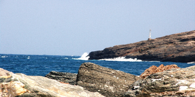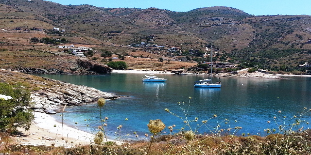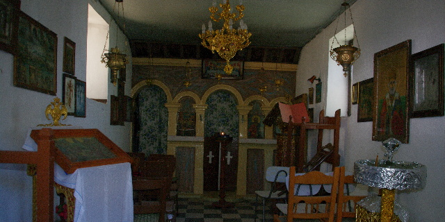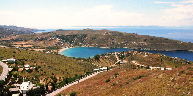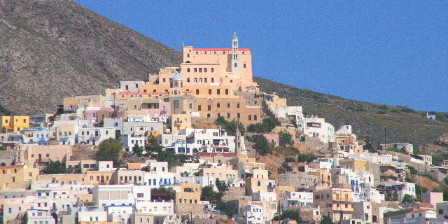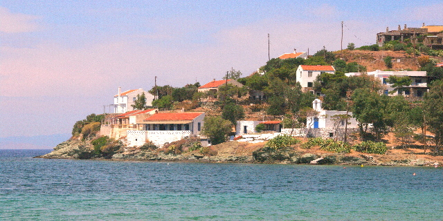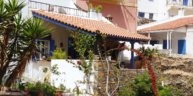 Dejamos atrás el pequeño puerto de Finika, que no nos ha dicho gran cosa, y bordeamos la costa sur de la isla, casi toda de acantilados donde aparecen algunas casas unifamiliares, siempre acompañadas de una pequeña ermita con su correspondiente tejado azul.