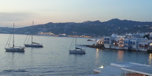 Afortunadamente la previsión es de una noche muy tranquila y nos volvemos a fondear en la bahía de Mikonos pueblo. Lo cierto que es un lugar privilegiado para fondear, aunque con el problema de que el desembarco en la pequeña playa es casi imposible pues las olas de los ferrys no permiten dejar en ella las auxiliares.