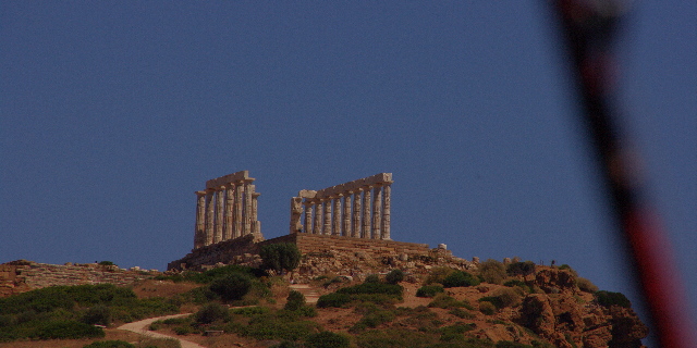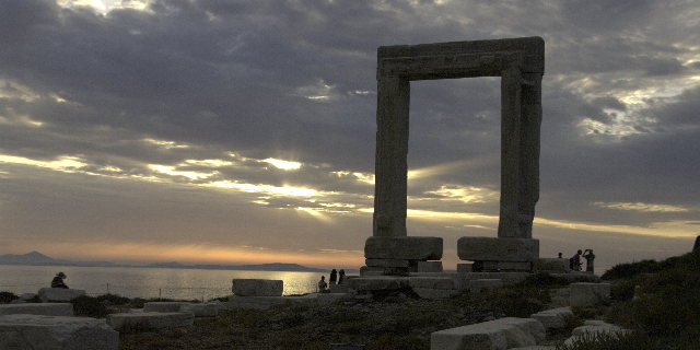 Solo queda en pié un descomunal pórtico de marmol con el que un grupo de fotografos trata de encuadrar la puesta de sol, que se niega a nosotros oculta por las nubes.