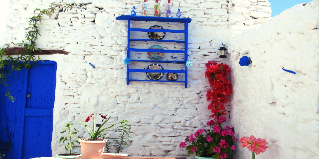 Y por todos lados el contraste entre las blancas fachadas con sus carpinterías en azúl añil.