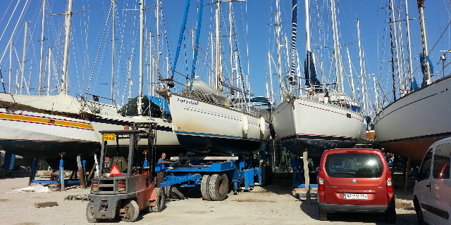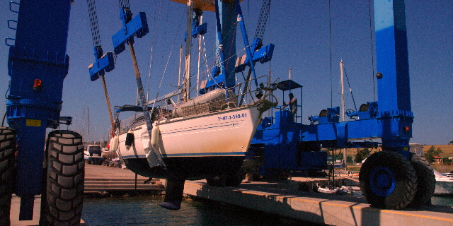 El sistema empleado por el varadero es simple. Unas cunas universales sobre las que se acuña el barco y un tractor que arrastra una plataforma hidráulica sobre la que, mediante unas vigas transversales, se apoya o eleva la cuna y el barco.