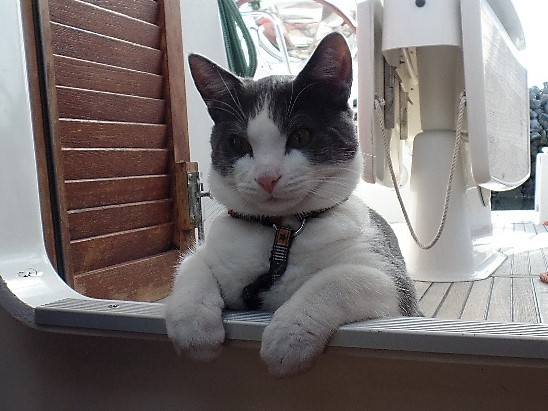 En travesía yo creo que se mareaba un poco, porque generalmente las pasaba durmiendo. Bien en la bañera o dentro. Nunca le pusimos arnés ni correa, pero tampoco pareció necesario.