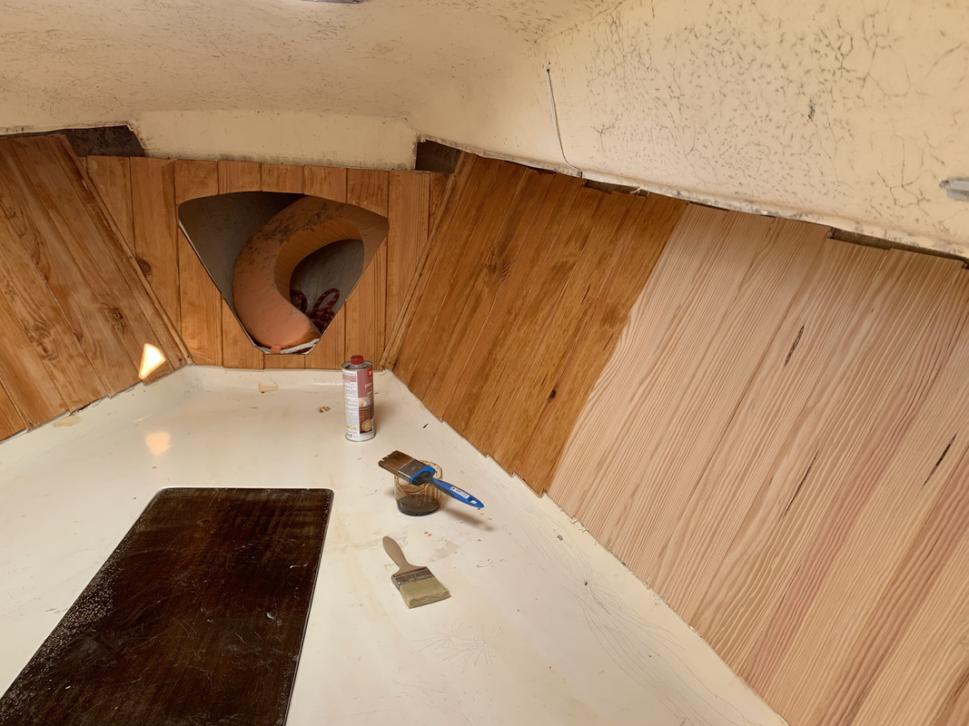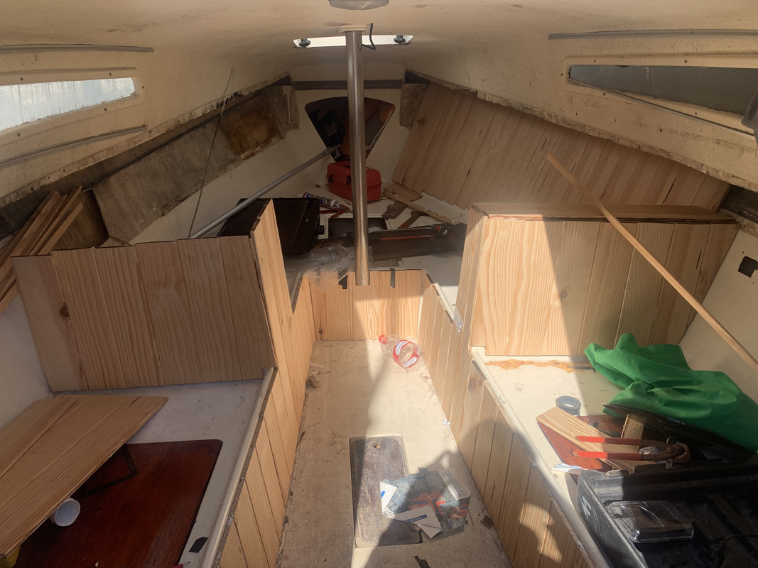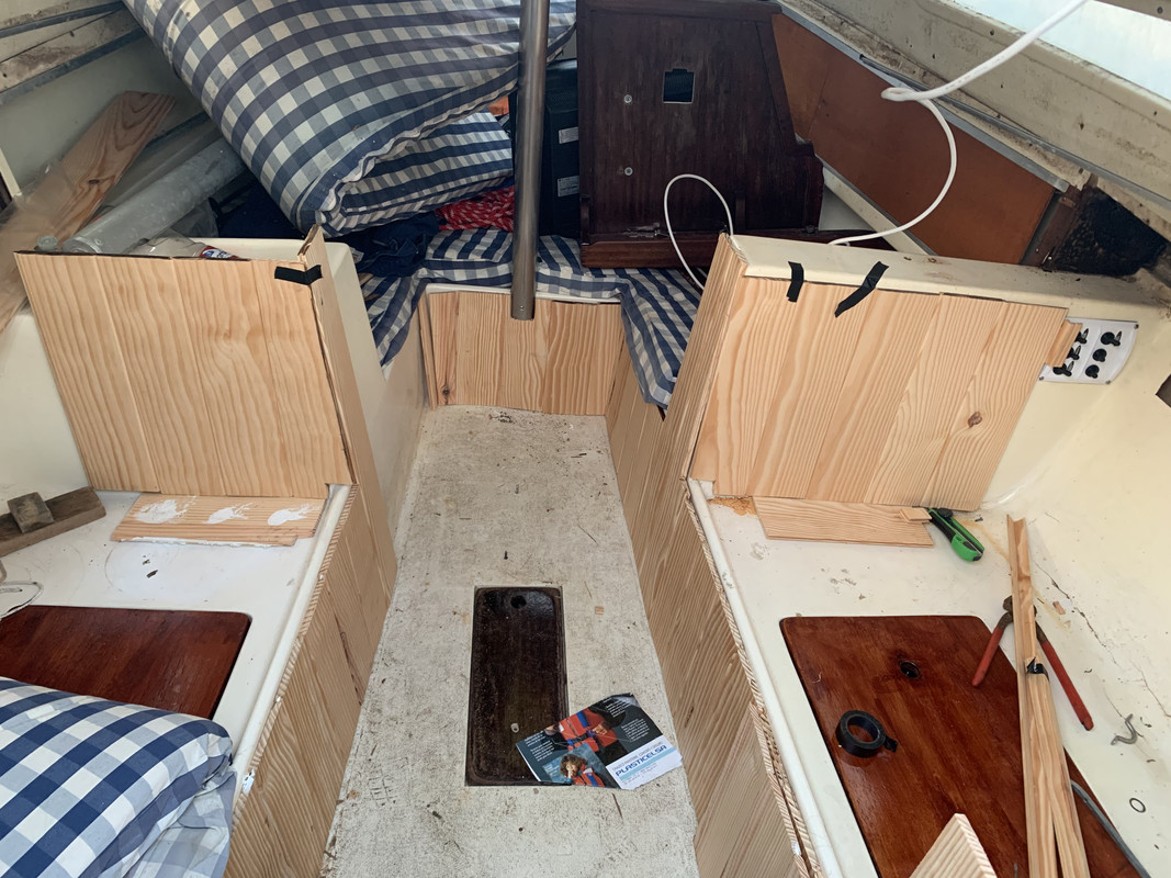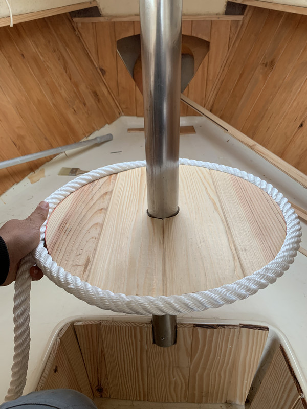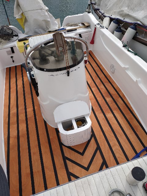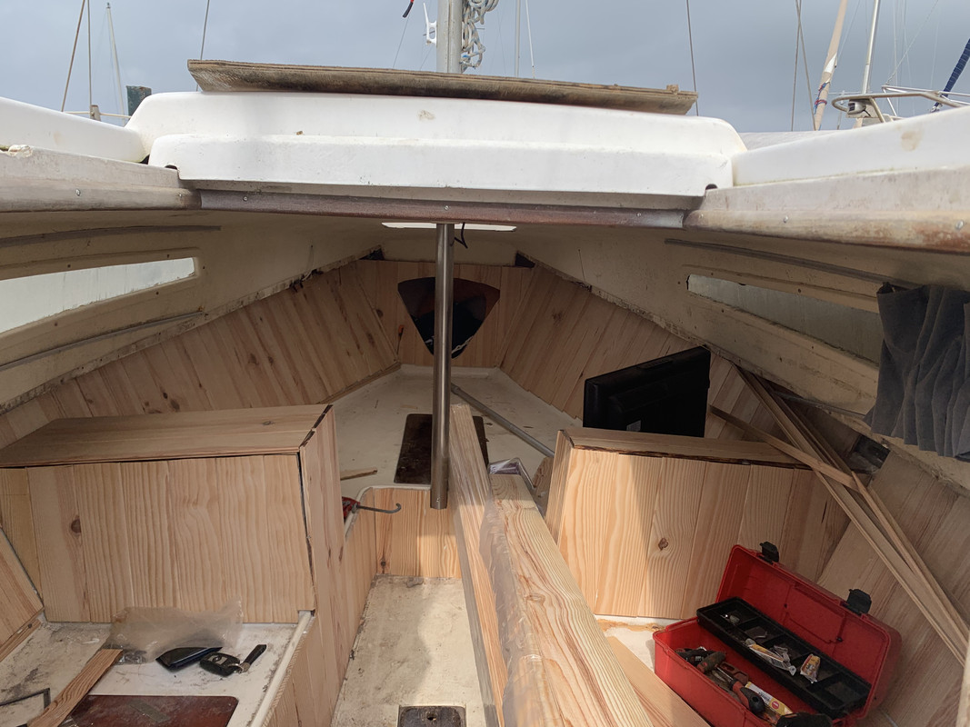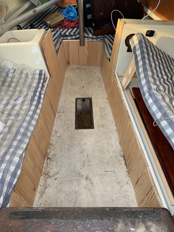 Solo una sugerencia, para la próxima vez: chapon marino, en lugar de pino. Pesa menos, aguanta más la humedad, se trabaja mejor y no es caro. Luego unas manitas de aceite de teka y queda precioso. Eso si, la belleza de las betas del pino no las tiene. Te paso foto para que veas como queda. Lo hice justo antes del confinamiento y solo lo he podido disfrutar dos veces. Antes tenía el suelo de moqueta y la tenía que cambiar cada año. Cuando se ponga muy guarro fregona secado y otro repasito con aceite. Enhorabuena y que disfrutes tu velerito. ![]()