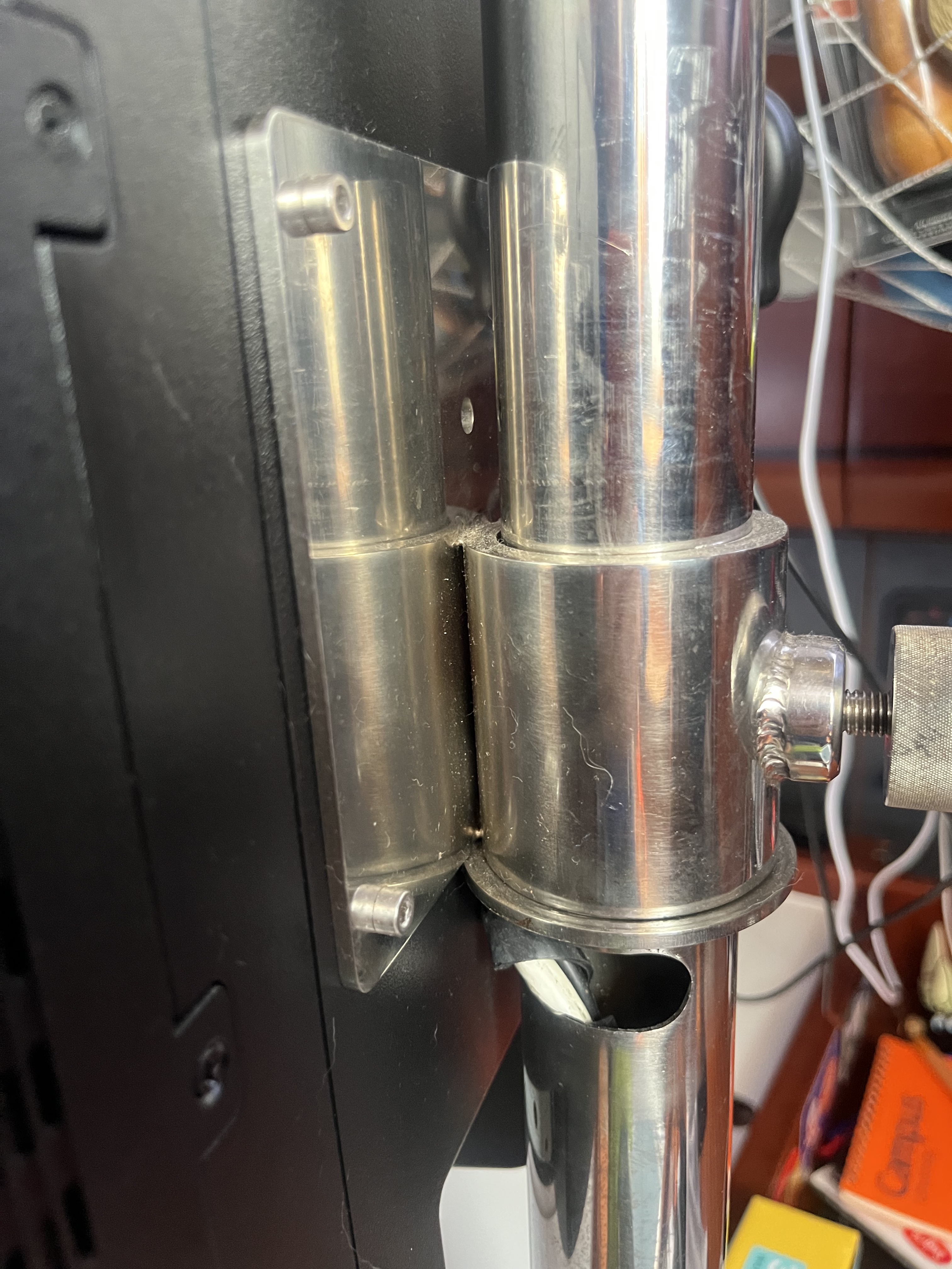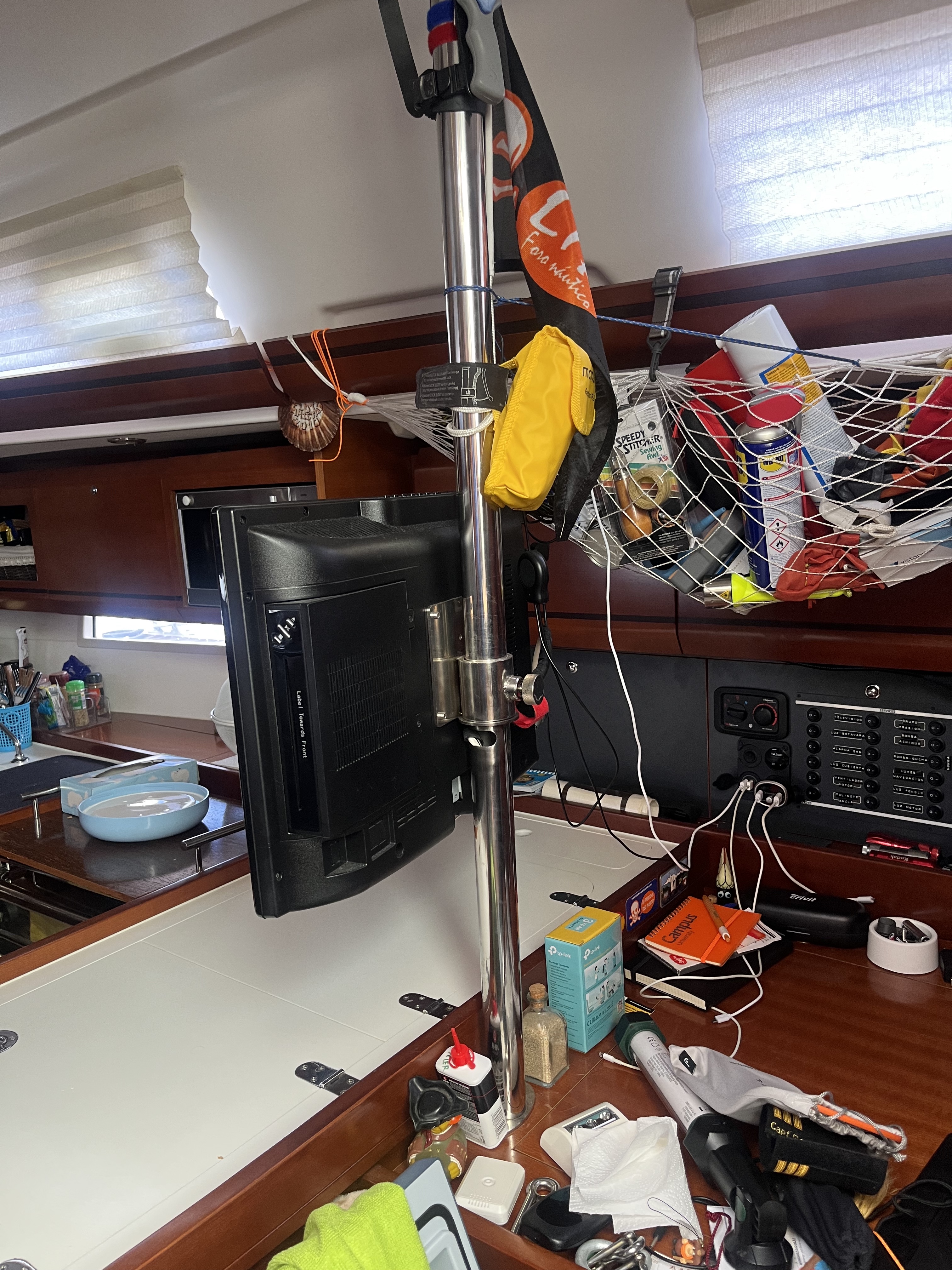 A mi también me gusta la barra, sólida y versatil, yo cuando navego extiendo el brazo contra el mamparo porque es donde no sufre esfuerzos con las escoras, a veces me olvido, pero este ha sido el unico modo de poder orientar correctamente la tv ya que si la pongo en el mamparo tendría un angulo pésimo.