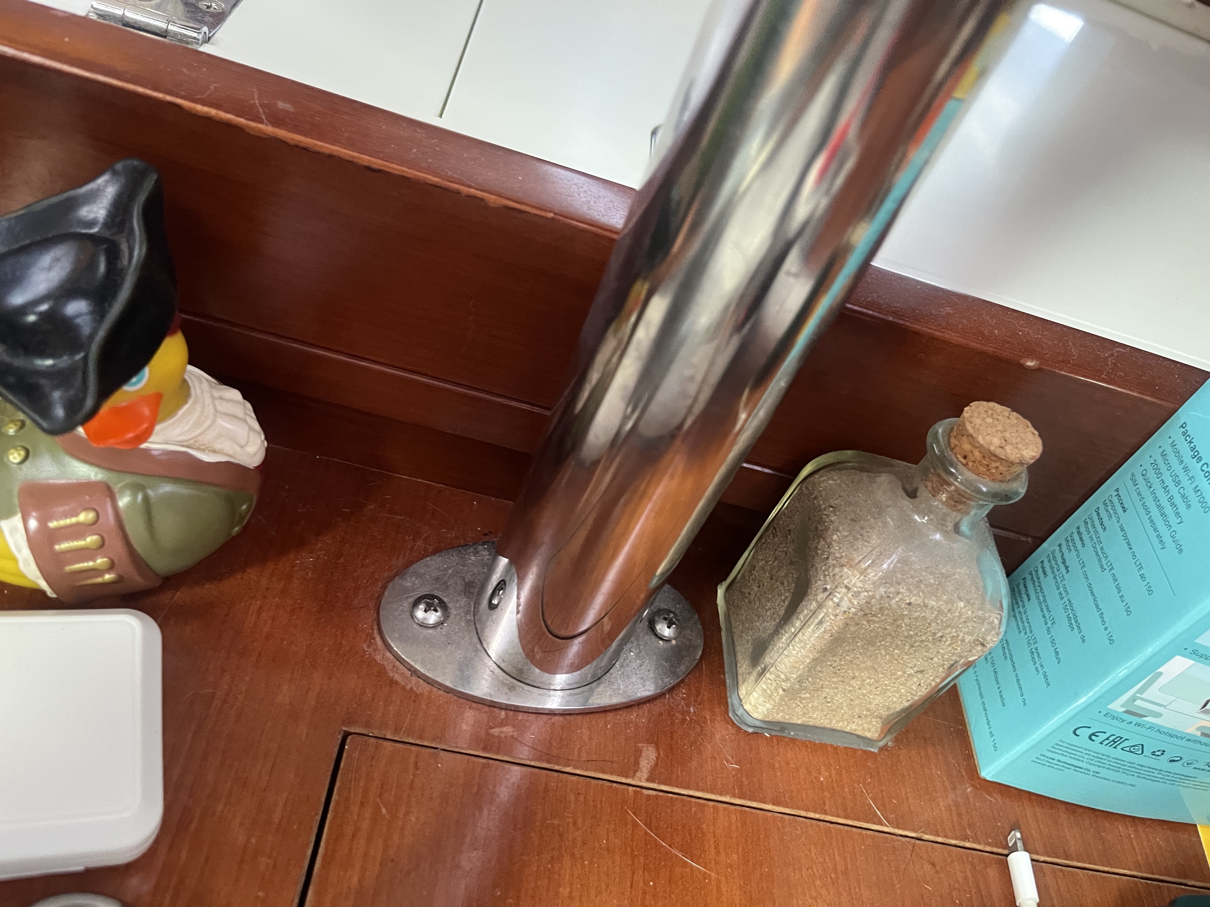 Muy buenas Beltham, yo lo que hice fue poner un tubo de inox 5 centímetros de diámetro con base en la mesa de cartas y sujeto arriba en el techo del interior del barco. Tiene una pieza para que no pueda bajar la tele de una altura y además gira sobre el tubo, por lo que puedo ver la televisión desde el sofá y trabajar en la mesa de cartas. Por cierto, los cables los metí por el interior y los saqué por la mesa de cartas.