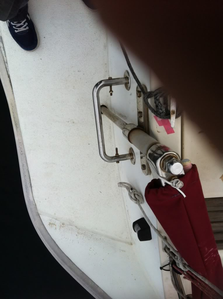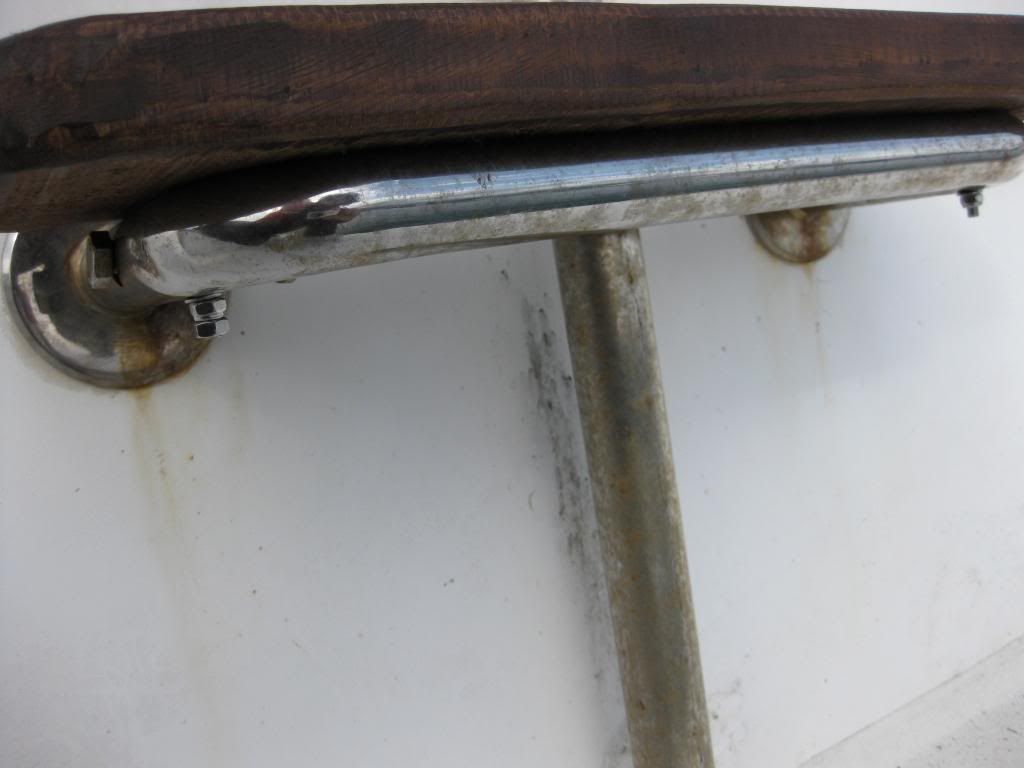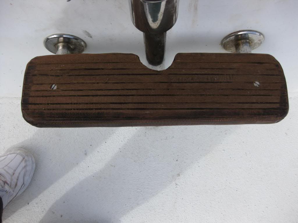 Yo en la escalera de popa tengo algo parecido al puente, pero hecho con una pletina recta de ac inox de las que venden en las ferreterias y estan ya agujereadas, la he torcido para que se pueda atornillar a ambos lados del peldaño de madera, no por el lado de inferior como la de la foto, si no por el lateral del peldaño con un tornillo tirafondo inox.