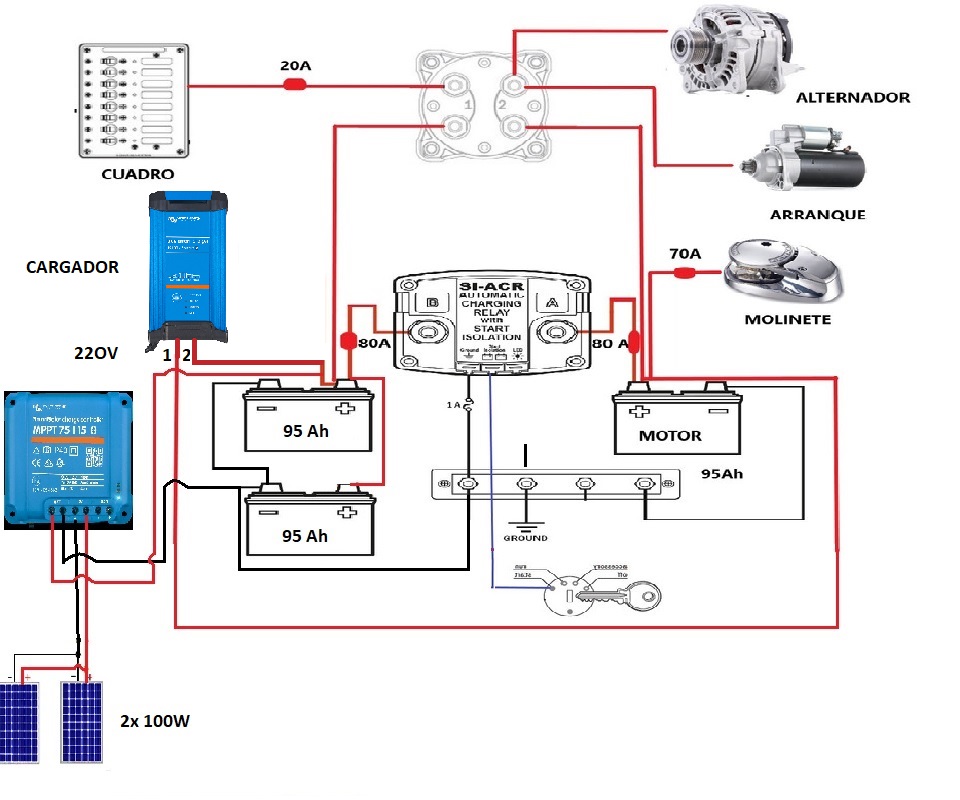 jonam52 Sí, tenemos un Mini 26 que según fabricante le corresponde una batería de 80Ah. Cuando compramos el barco llevaba una sola batería de 95Ah por eso nos hemos quedado "de serie" con 95Ah. De todas maneras para poderla cargar con el alternador por muy aislada que la tenga del otro banco necesitaré un separador de baterías.... ¿no? Eien No he entendido eso de: "y la futura carga solar, la llevaría a las 2 en paralelo de servicios" Te refieres a esto: ![]() Y ya aprovecho y te pregunto: La sección del cable solar a 6mm2 la ves correcta? Que magnetotérmicos pongo a la entrada y salida del regular solar? Hay que configurar de alguna manera especial el regulador ANTES de conectarlo a los paneles solares? |