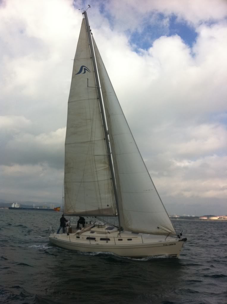 El jueves salimos 3 barcos, Aleco (Hanse 371), Sukita (Elan 310) y el que escribe, Shackleton Henry. Buen viento de levante de unos 14 nudos con mar plato. Tiramos hacia el norte de la bahia, desde donde dariamos comienzo esta batalla y de alli a la boya del aeropuerto de Gibraltar y "siguiendo las instrucciones de Regata" dejarla por estribor (quedo claro auqnue digan lo contrario) y de alli a puerto. En un primer momento el Aleco se pone en cabeza con su armador a la caña seguido del Shackleton y el Sukita que se va a por uvas. LLegando a unos de los barcos fondeados viramos hacia la boya de Gibraltar, seguido lo hace el Aleco, que se pone a "barlo" pero que poco a poco va quedandose atras irremediablemente al igual que el Sukita. Doblamos boya con clara ventaja dandonos tiempo suficiente para hacer una tomas fotograficas de la pelea entre los otros dos barcos.