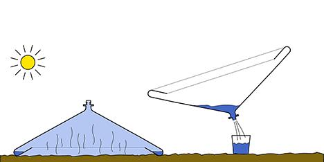 Se venden unos desalinizadores de emergencia que son como un cono negro con la punta hacia arriba sobre un aro flotador hueco. Todo ello se pone sobre la superficie del mar y el calor dentro de este cono evapora el agua superficial, condensándola en los laterales internos y resbalando hasta almacenarse el el flotador. Luego se le añaden dos o tres cucharadas de de agua salada para recuperar un cierto nivel sales, suficiente para sobrevivir mucho tiempo. Algo parecido a este, que es para tierra, pero con la base flotante, inflable y las paredes de tela plástica negra. ![]() LSV.