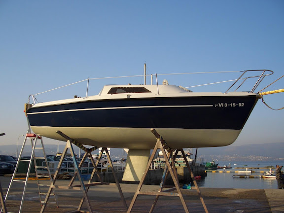 La segunda vez fui depurando la tecnica y lo hice en la mitad, ahora con el nuevo remolque utilizo la polea para arbolar, tiro un cabo al bastago del timon por popa para que haga de back-stay (cosa que este barco no tiene) y con la polea engancho el stay de proa y carra carraca raca carraca, "pa riba", pongo los obenques, saco el motor de debajo de la bañera, envergo las velas, pongo el timon y pal agua. No es dificil pero requiere de ganas.