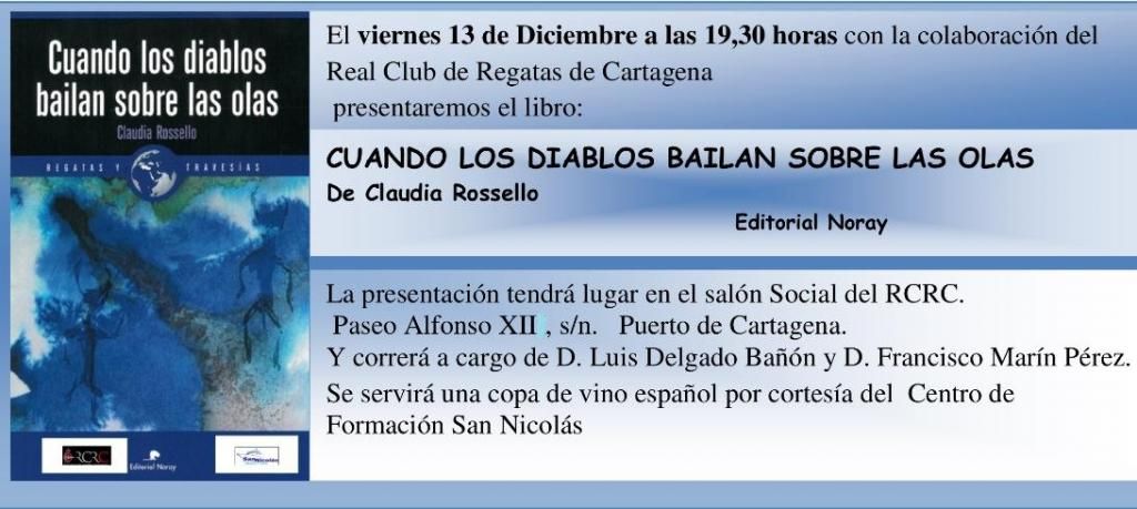 ![]() Hola a tod@s y ante todo unas rondas: Abro este hilo para informar que el próximo viernes 13 de Diciembre a las 19,30 horas, con la colaboración del Real Club de Regatas de Cartagena, tendrá lugar el acto de presentación del libro ``CUANDO LOS DIABLOS BAILAN SOBRE LAS OLAS´´, de Claudia Rosello. La presentación tendrá lugar en el salón Social del RCRC Paseo Alfonso XII, s/n. Puerto de Cartagena. Y correrá a cargo de D.Luis Delgado Bañon y D. Francisco Marín Pérez. El libro es una auténtica pasada. Basado en hechos reales, narra como se las apañaron Claudia Rosello y Rodolfo Ulises Otero, para sobrevivir a un huracán que les sorprendió en la costa de Brasil...que sin duda, cambio sus vidas. Desde luego, os animo a asistir y espero que lo leáis pronto. Habrán rondas reales pues, se servirá una copa de vino español por cortesía del Centro Formación San Nicolás. Aprovecho este hilo para rescatar un hilo que puse hace un par de semanas pues, Tanto Claudia como Rodolfo, están organizando todos los viernes en El club Naútico de los Nietos, unas tertulias marineras que están siendo un éxito. http://foro.latabernadelpuerto.com/s...d.php?t=118396 Un saludo y nos vemos en la presentación!! ![]() ![]() ![]() ![]() Editado por aeiou en 09-12-2013 a las 17:47. |